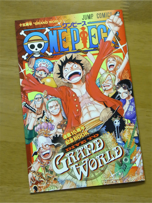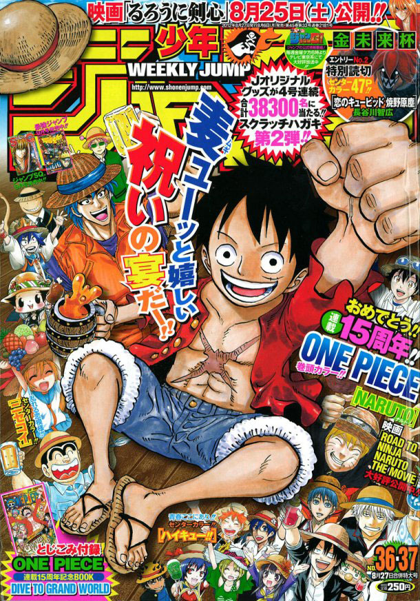 ワンピース連載15周年の記念号。表紙では連載作品のキャラクターたちが麦わら帽子を被って祝ってくれています。