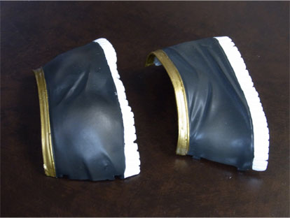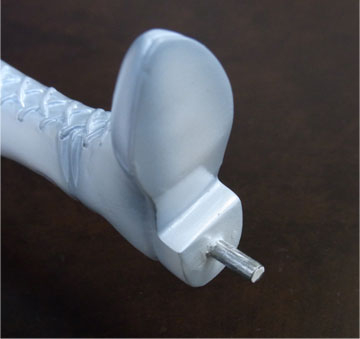 左足底にある金属の棒を台座の穴に差し込み固定させます。ポリストーンはPVCに比べ脆いのですが、倒れて部品が折れてしまう心配はこれで無用です。