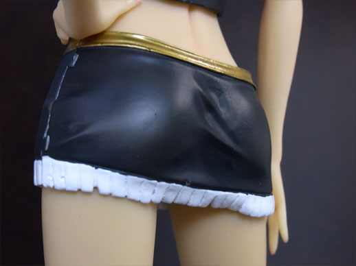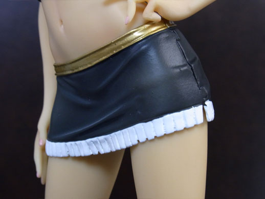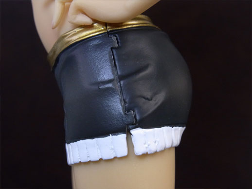 接着は肩ヒモ部分以外不要で♂♀の溝を合わせれば留まります。肩ヒモ部分の接着後でも、ボディからトップスは着脱可能です。いじっていたらポロッといってしまったので、写真のトップスは3パーツになっていますが、これも接着剤で接着すれば問題ありません。色移り防止の為、前回同様消しゴムで内側をゴシゴシして処理しました。服のパーツは”