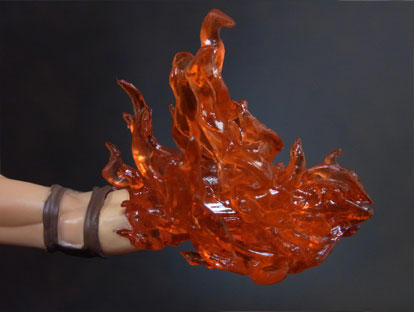 メラメラのエフェクトがクリアパーツで再現。よく見ると他の差し替え腕パーツと同じポージングの拳が造形されています。