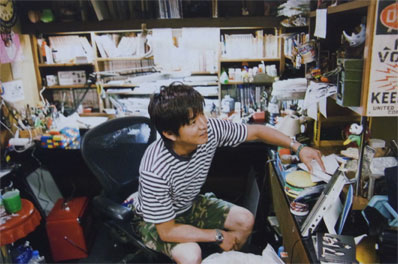 栄ちゃんの作業机に座る木村さん