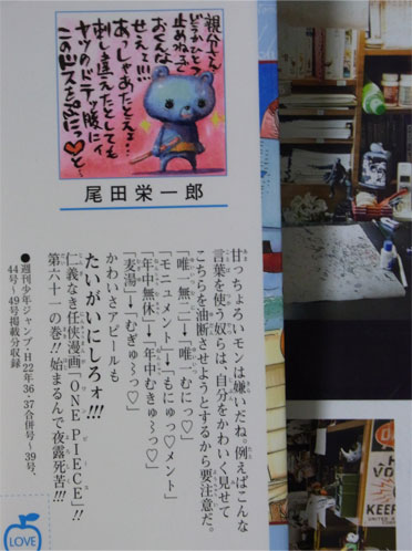 尾田 「そういった気持ちがあの表紙の裏のコーナーにも表れているのかもしれませんね。何だろう、マンガ家って面白いもの描いて黙っていたらカリスマになれると思うんですよ。ただ、僕はそうじゃなくて、読者にとってできるだけ近い存在になりたかったので、あえて自分からバカを晒すほうを選びました。そんなわけで、読者は僕のことを相当バカにしてますよ(笑)。」