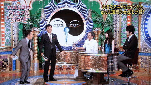 一応、本題のさんまさんへの「オススメのアニメキャラクター」では、原口さんは「ケメコデラックス」のケメコ、栗山千明さんは「侵略!イカ娘」の「イカ娘」を紹介。土田さんは原口さんのトークが盛り上がったことで打ち合わせした内容を一個も話せずふて腐れ、第二弾の出演を約束して「オススメのアニメキャラクター」は言わずに終了w こちらのパートは司会2人の新鮮なリアクションが面白かったので第二弾があれば是非見たいところです。