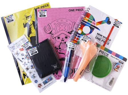 (B5ノート2種、麦わら海賊マークを箔押加工したケース付メモ、3色ボールペン、ルフィのギガントボールペン、海賊旗ステッカー、チョパーのクリップトレイ、麦わら海賊旗をデザインしたB6リングノート)