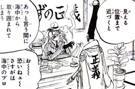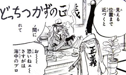 燃え上がる正義」という柄に合わない正義を掲げていたが、悩みぬいた末、「だらけきった正義」に行き着いたそうな。黄猿はそれらを俯瞰で眺め、一番いい位置を決めたという意味で「どっちつかずの正義」とのことです。