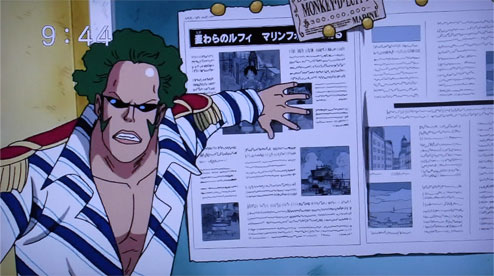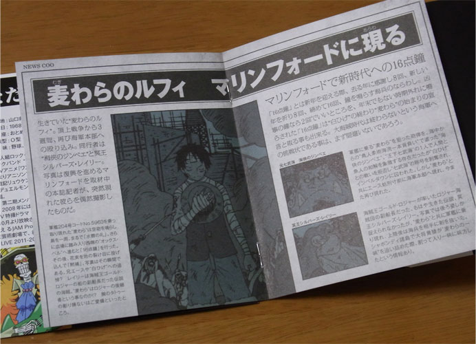 ニュースクーの切れ端が折りこまれていました。イラストはアニメ版。原作やアニメではぐちゃぐちゃとなっていた記事がしっかり活字で書かれています。「腕のタトゥーの彫り損ないはご愛嬌といったところ」とあり、記者達もルフィの”メッセージ”に全く気づいていない様子が伺えます。