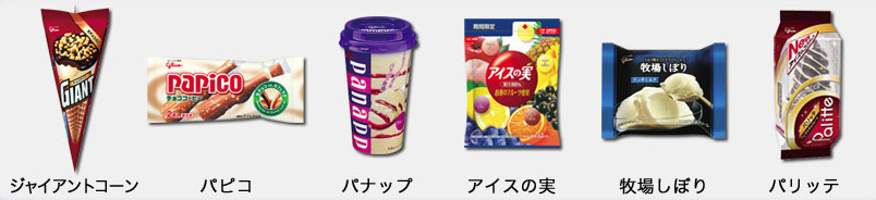 「ジャイアントコーン」「パピコ」「パナップ」「アイスの実」「牧場しぼり」「パリッテ」