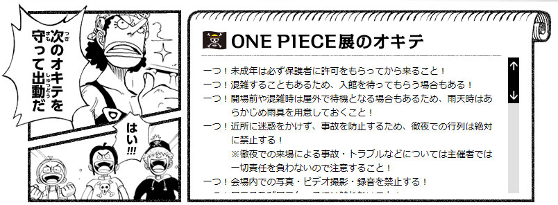 栄ちゃん自ら完全監修の下、描き下ろしを含む原画やスペシャルムービーを通して連載15周年のワンピースのこれまでの冒険のすべてが体感できる展示イベント。さまざまな仕掛けが施された体感型の展示が中心で、公式パンフレットやオリジナルグッズなども販売する。