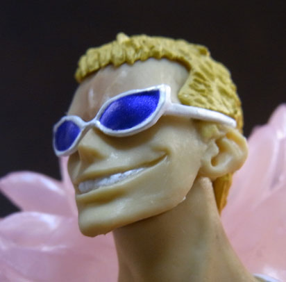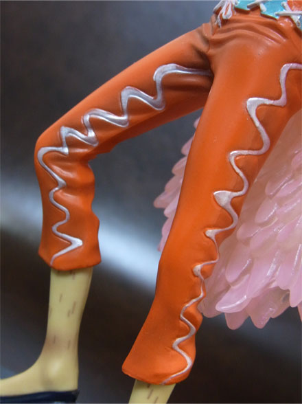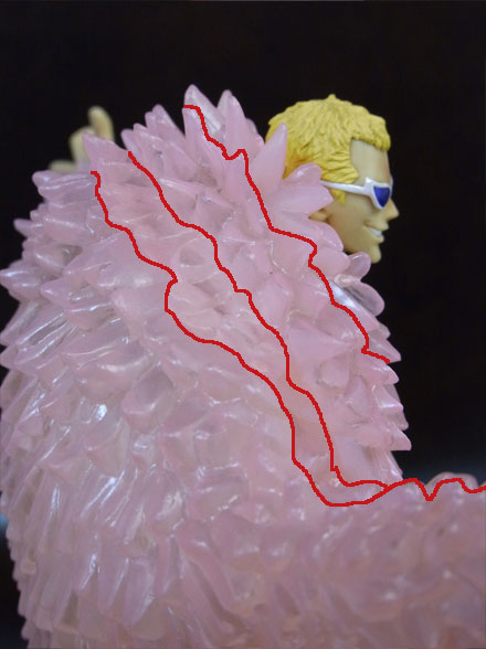 この個体はサングラスのグラス部分が綺麗に塗り分けられていますが、他の大部分の個体ははみ出し・塗り漏れがあります。フィギュアは顔が命。ここがZEROドフラミンゴの出来を左右するクリティカルなポイントであり、サングラスが綺麗に塗り分けられている個体は本当に稀です。おそらく予約で買ってハズレを引いた人は多いんじゃないでしょうか?だからZEROは店頭で見てから買うべきとあれほど言ったのに(ぁ