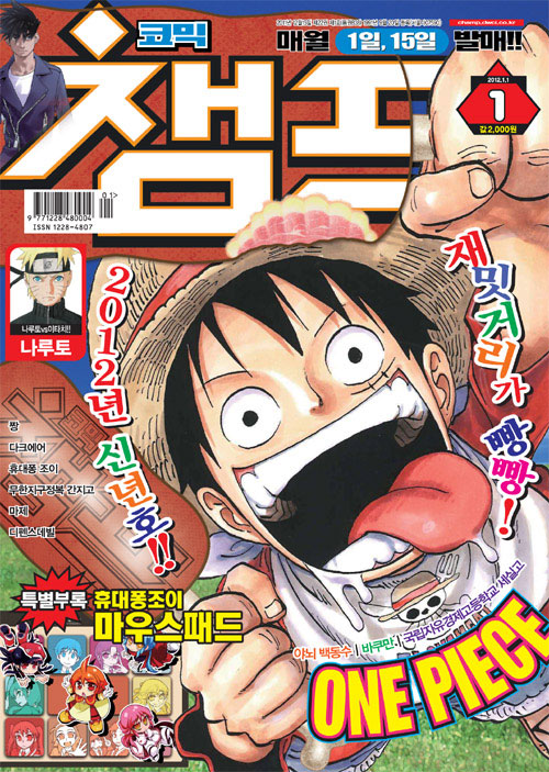 毎月1日・15日発売、価格は2,000ウォン(約140円 ※1ウォン=約0.07円)。ジャンプ系の連載は「ワンピース」の他、「ナルト」や「バクマン」があるみたいです。表紙はジャンプの11年45号のもの。