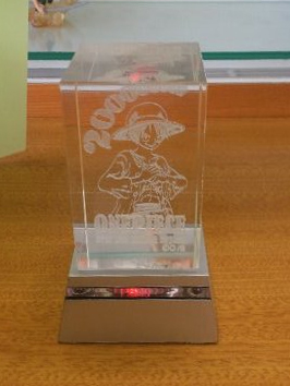 ワンピグッズがディスプレイされています。向かって左上段にあるのはプライズのぬいぐるみチョッパーでしょうか。マグカップは一番くじかアミューズメントプライズ?中段は一番くじカードスタンドフィギュア、下段はサインとプラモデルサニー号ですね(たぶん)。