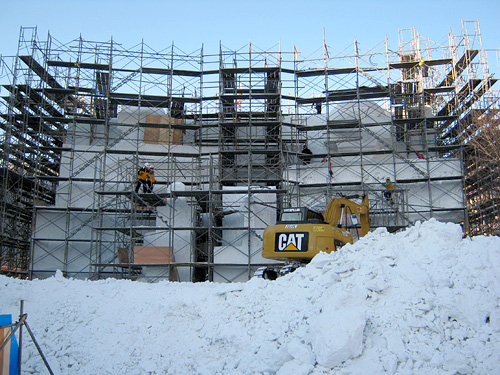 制作14日目にあたるこの日は各キャラクターの像を掘り出すブロックを粗く削り出したところ。開催は2月6日(月)から。これからが作業本番です。