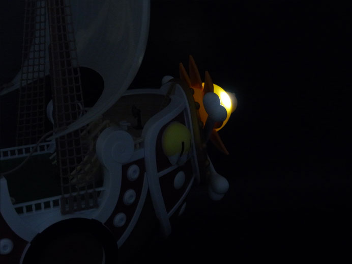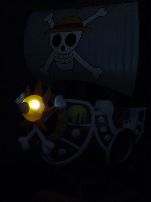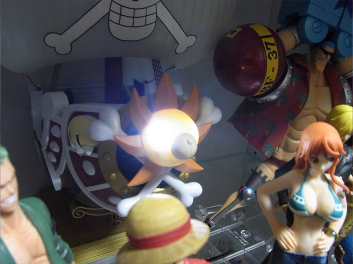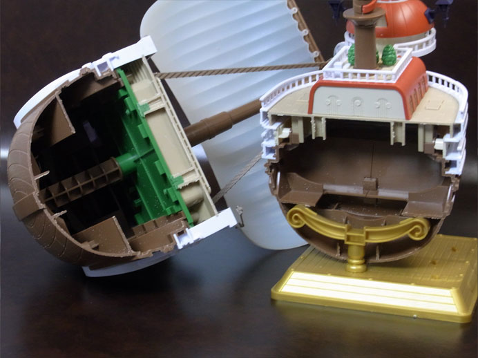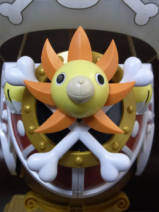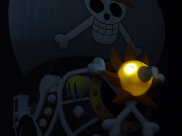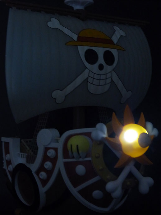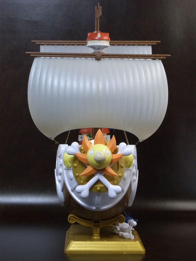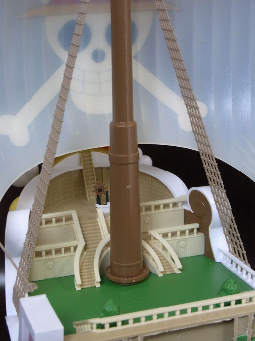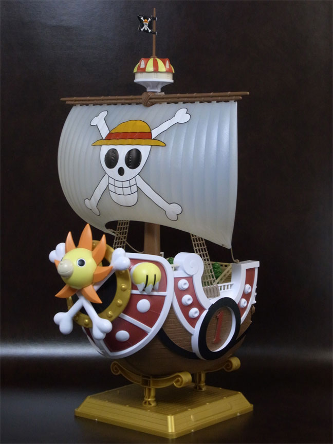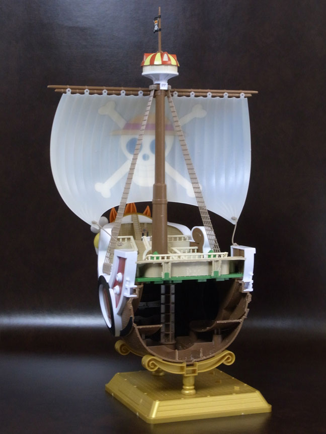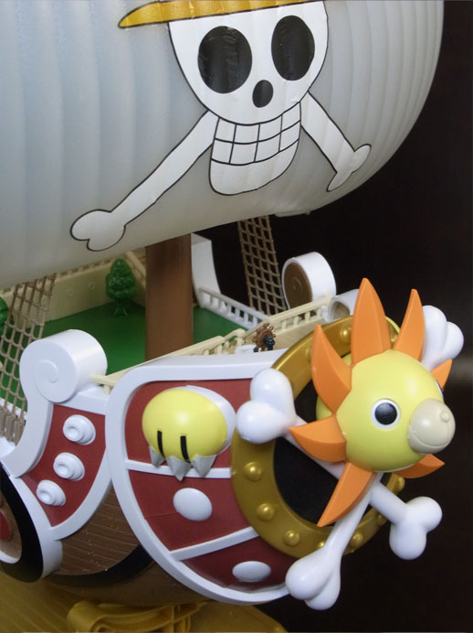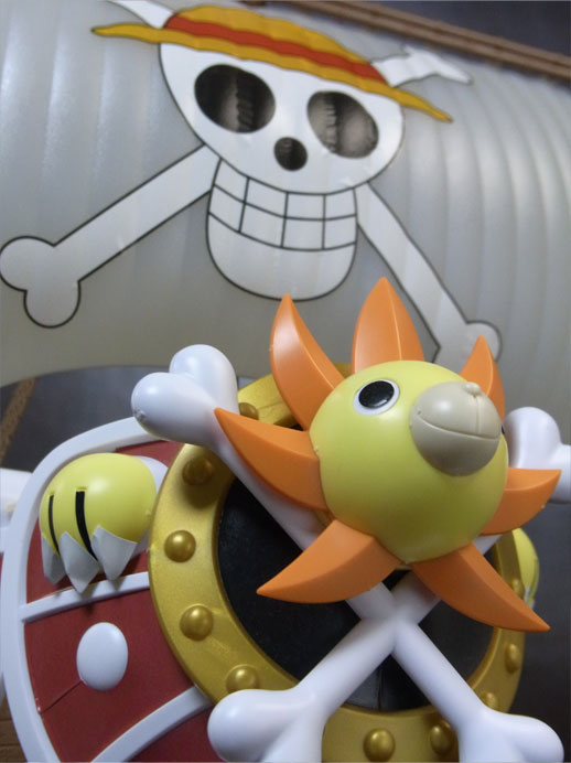 コレクションケースのスペースの都合でサニー号の後ろ半分をカット、海賊旗は上の空間が無駄になるので取り外しています。