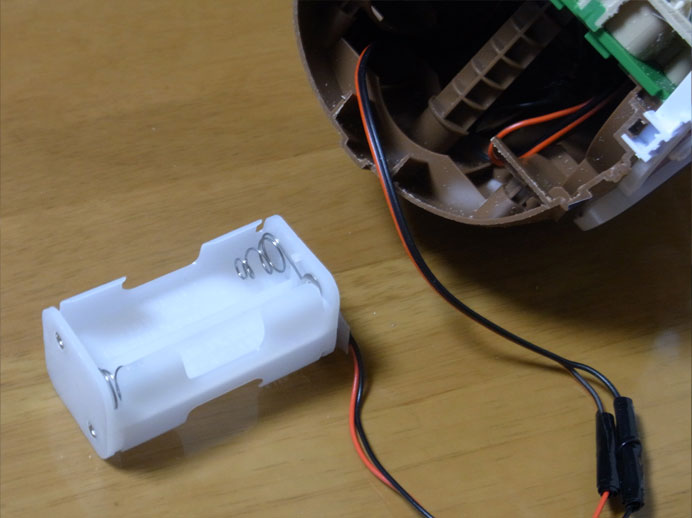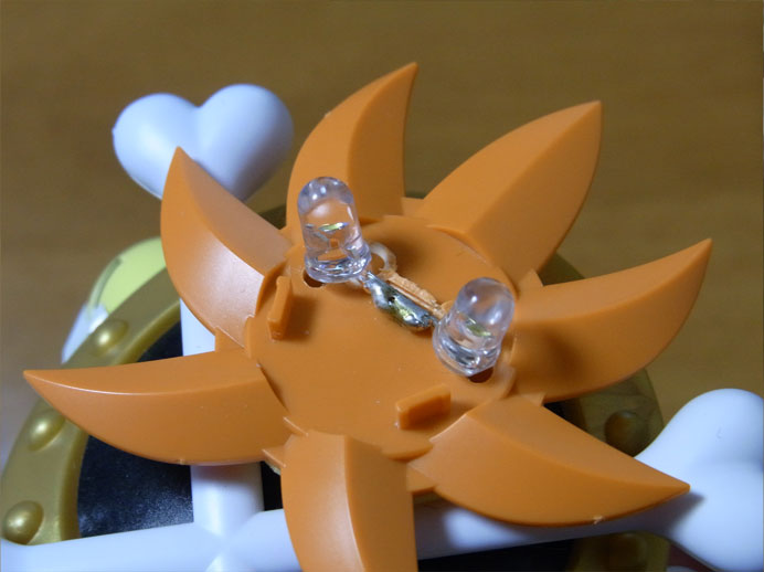 ライトは発光ダイオード(LED)。ドリルで内部に穴を開けて配線を通し、はんだづけしています。
