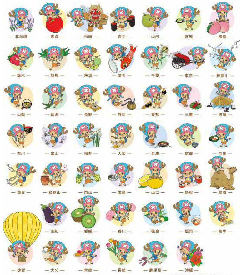 東京は人力車、北海道はラベンダー、秋田はなまはげ、大阪は串カツなどなど。チョッパーが新世界編に変わっただけでなく、都道府県のモチーフも