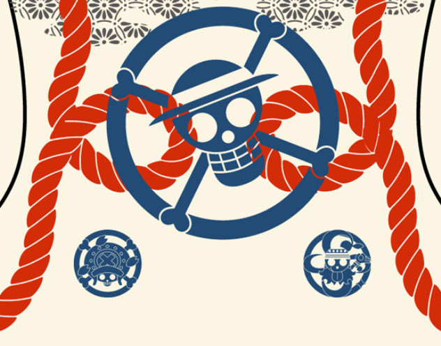 ルフィをイメージしたオフホワイト地に青と赤の配色が鮮やかな粋な火消しスタイル。オモテ面に