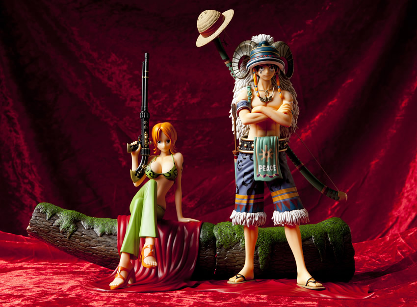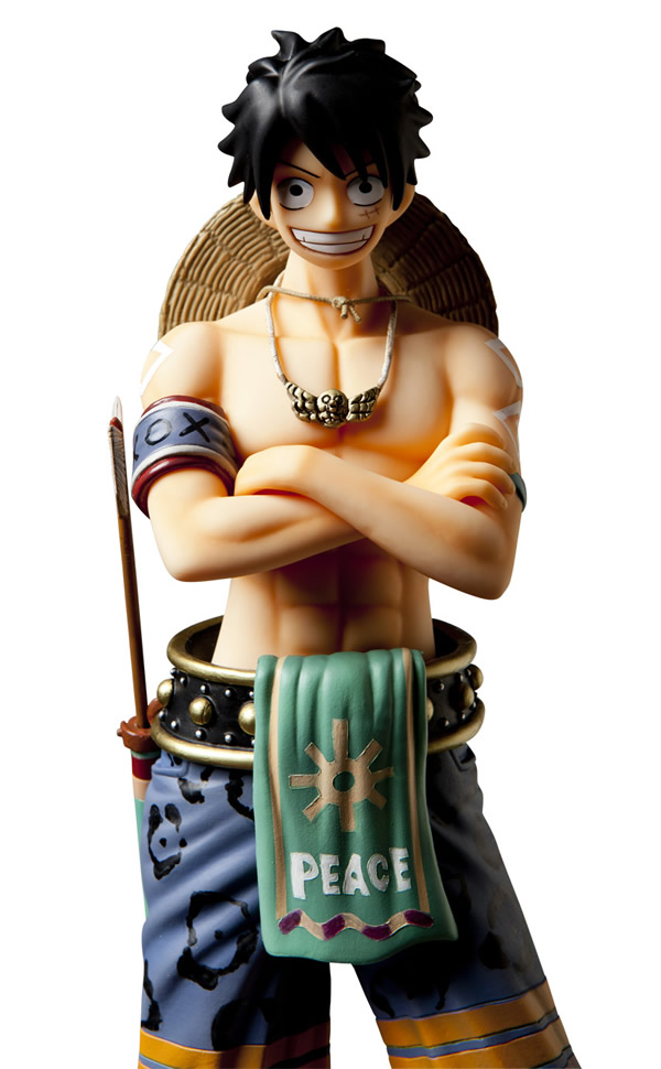 ロングホーンと白毛を配した帽子を被り、巨弓を携えた森の戦士に扮するルフィを再現!