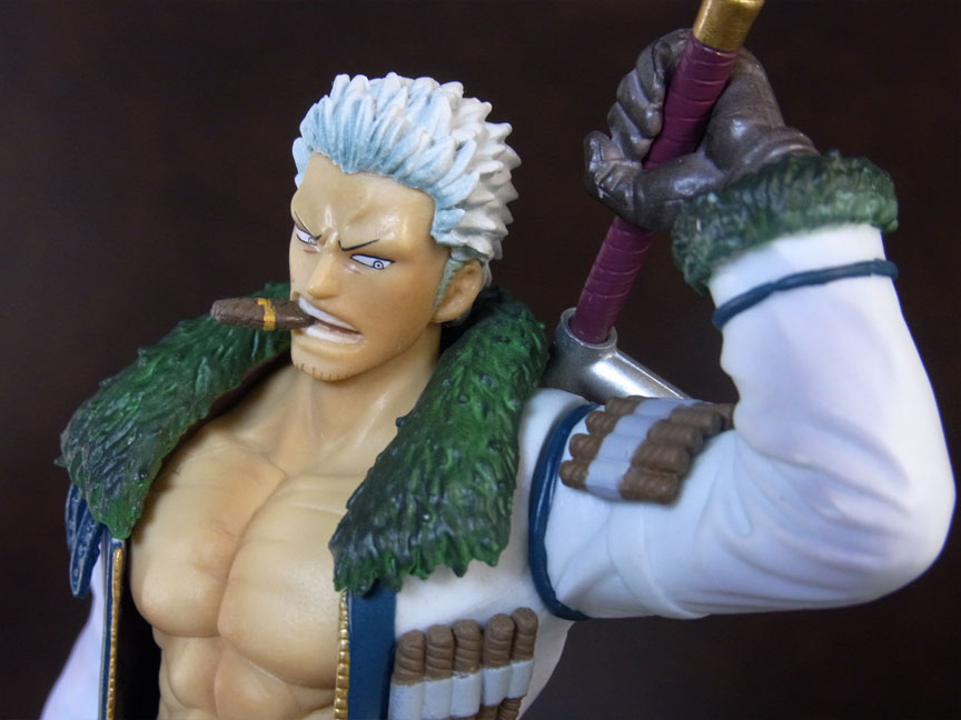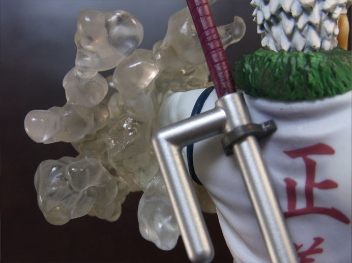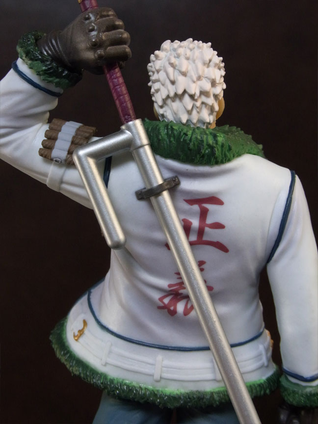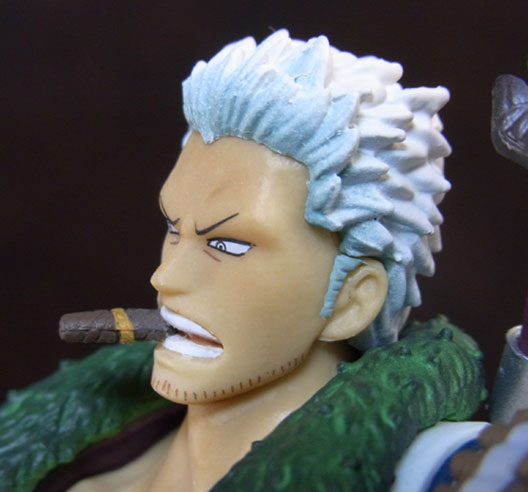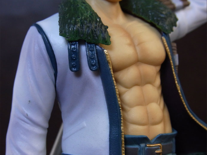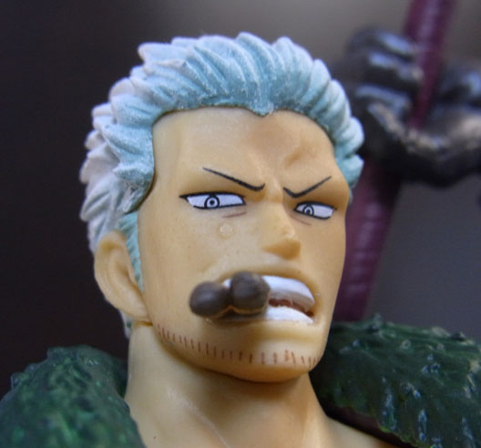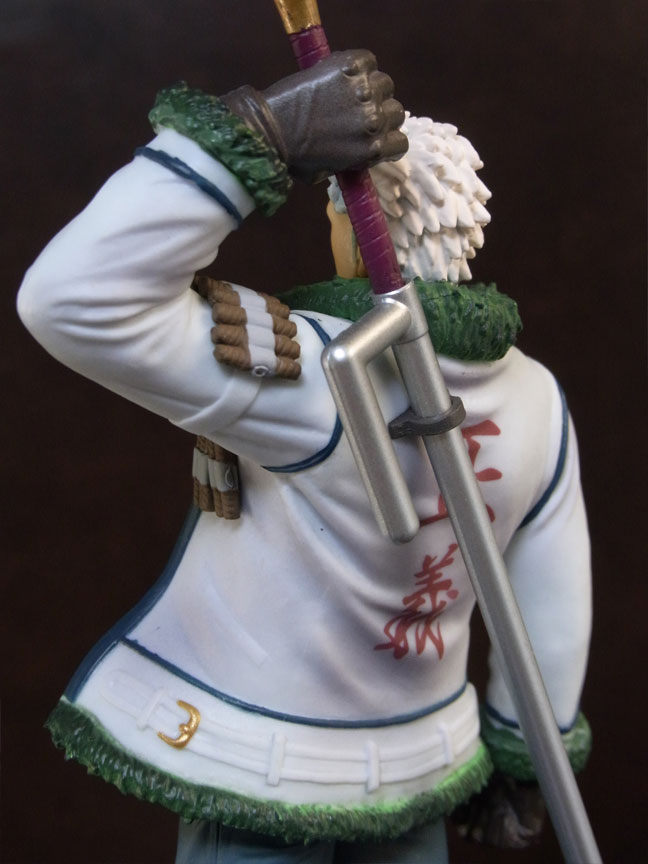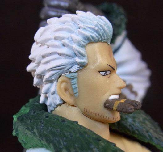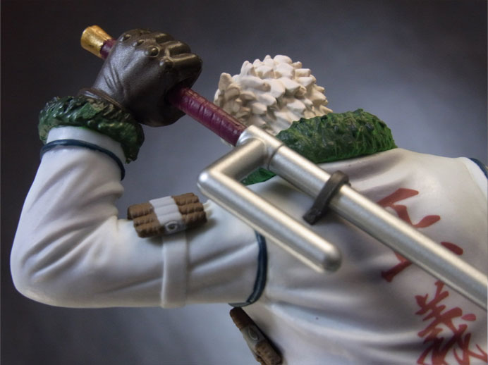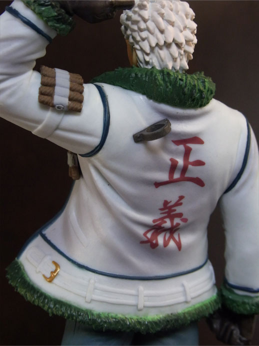 目線の先の向かって左斜め下から覗くと、特に似ています。眉間の皺、こめかみ、口の曲がり具合など細かなポイントをよく押さえて造形されており、キャラらしさが出ています。肌は薄く塗装されて、目、眉、目元の皺、ヒゲはプリント。