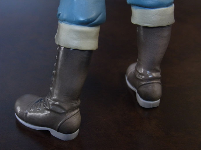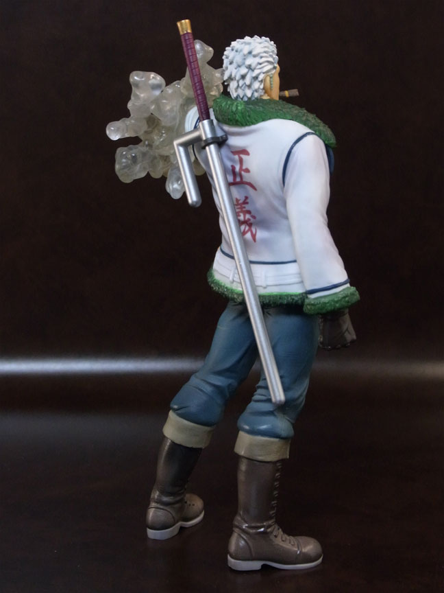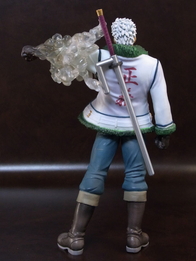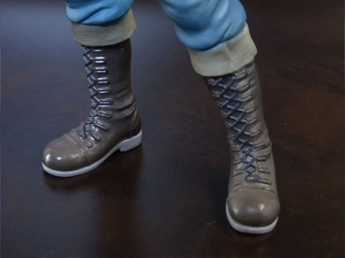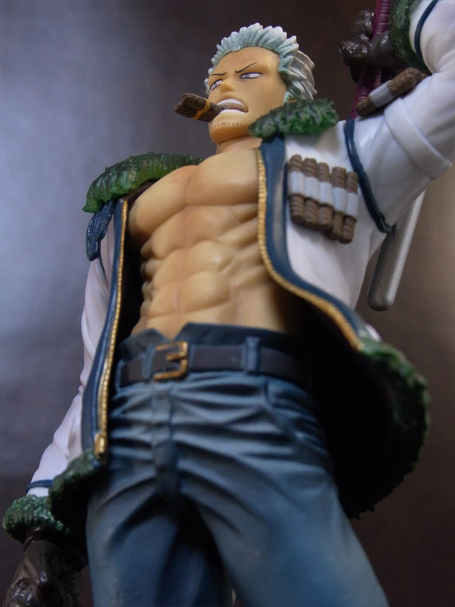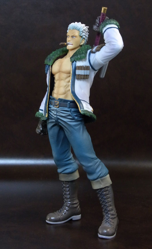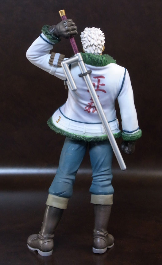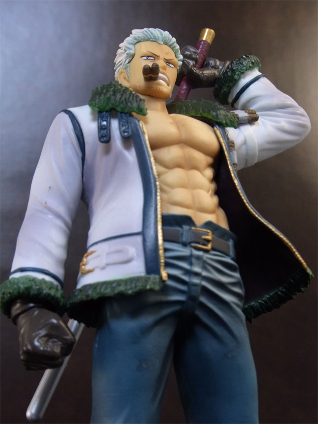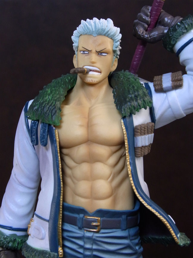 目線の先の向かって左斜め下から覗くと、特に似ています。眉間の皺、こめかみ、口の曲がり具合など細かなポイントをよく押さえて造形されており、キャラらしさが出ています。肌は薄く塗装されて、目、眉、目元の皺、ヒゲはプリント。