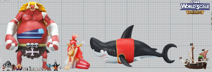 その商品サイズは、大型キャラクターも商品化してきた、「1/144 WORLD SCALE ONE PIECE」シリーズ史上No.1です。楽しいときも悲しいときも、いつも「しらほし姫」と一緒の「メガロ」。愛嬌ある笑顔や服の「クリミナル」のマークは忠実に再現されています。
