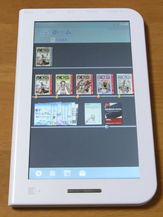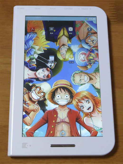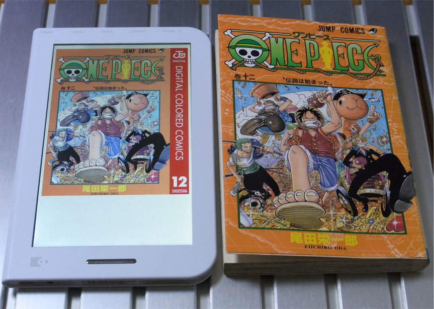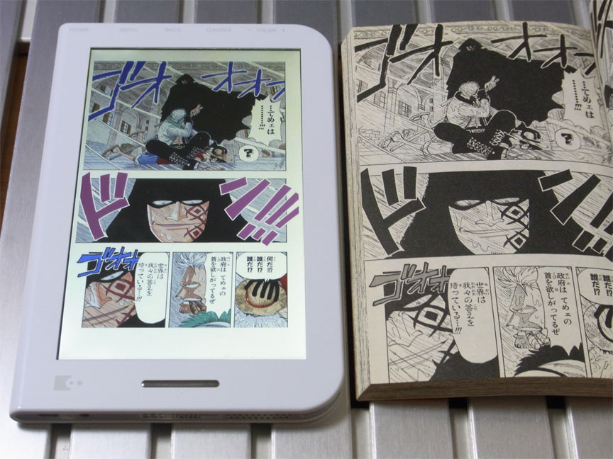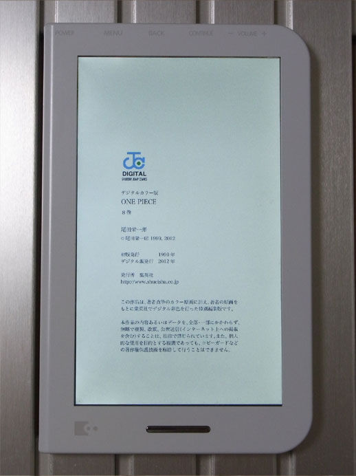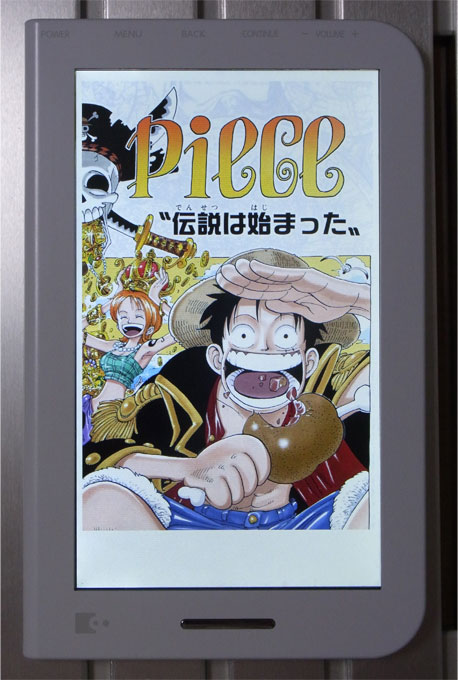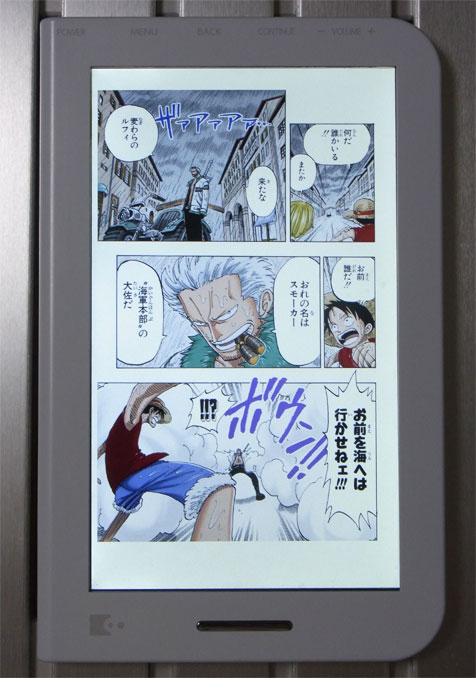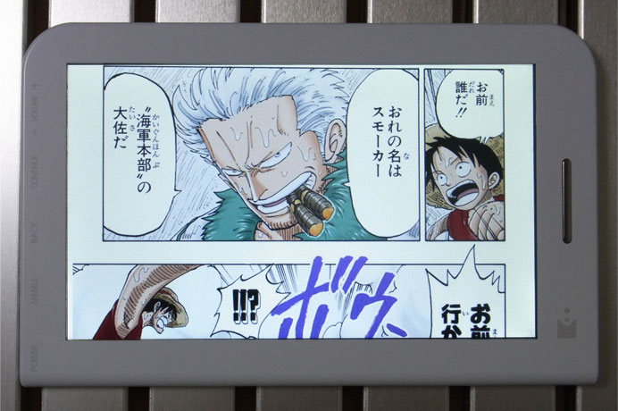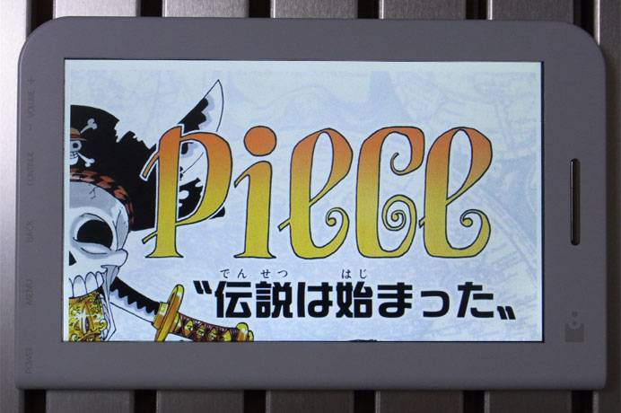 本体自体(あるいは内臓アプリ;ブックリーダーVer.2.0.2)の性能というよりは、本製品で「デジタル版ワンピース」を読む場合に限った評価ですので注意してください。デジタル版コミックスの仕様は統一されておらず、他の作品でも同じ挙動にならないからです。フルカラー版の内容についてのレビューは前回と前々回を参照してください。