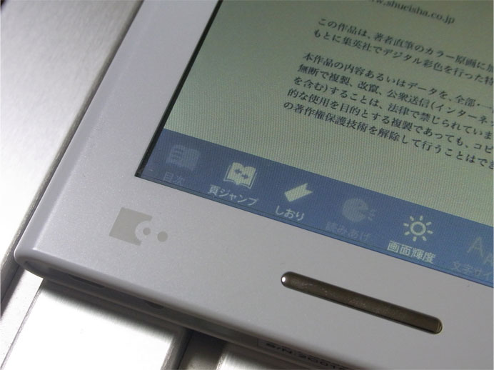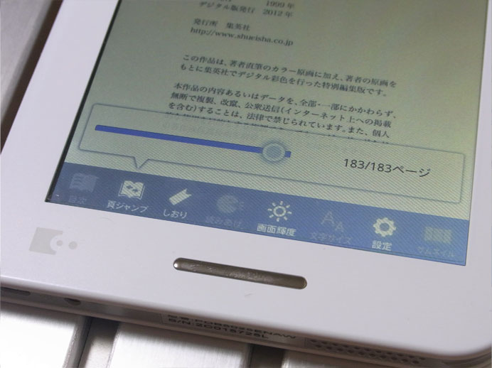 最終ページまで読んだ場合は必ず手動で戻さなければなりません。この場合、製品本体の上部にあるメニューボタンを押し、「頁ジャンプ」をタッチ、ポップアップするスライドをフリックしてページを戻すことになります。このフリック操作で目的のページに合わせるのは少々難しく、かなり煩わしいです。