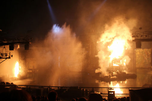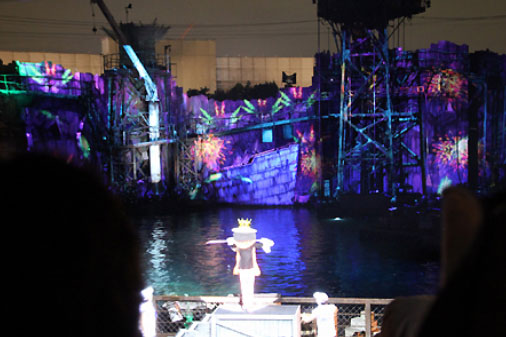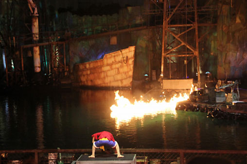 同ショーはアトラクション「ウォーターワールド」のセットを舞台にし、