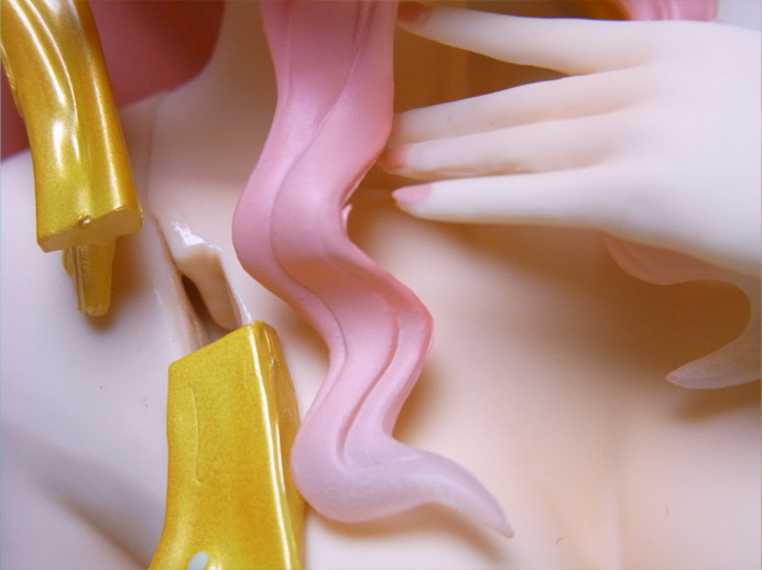 しかし、キャストオフをしたところで接着剤は残り、ダボ穴とブラで隠れていた胸部のパーティションラインが丸見えになってしまうため、興ざめな感があります。技術がなければ、寧ろ