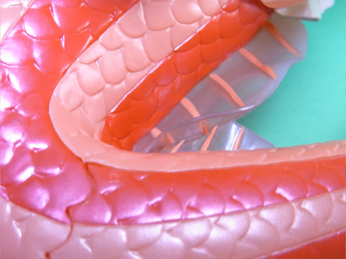 折れ曲がった後ろ辺りに大きなパーティションラインがありませんが、鱗の形に沿って波打ったつなぎ目になっており、目立たないような工夫がされています。