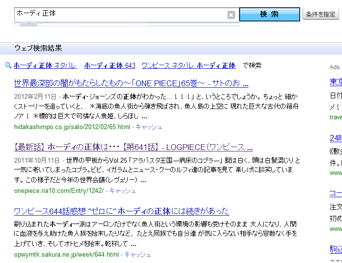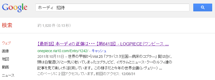 原作641話の感想記事が上位にヒットするため、アニメを見てホーディの”正体”を知りたくなった人が当ブログに流れ込んできたのです。このスクリーンショットは次の日に撮ったもので当日の検索結果と異なっており、当日は検索結果1番目と2番目はホーディの”正体”が判明する原作643話を受けての2ちゃんねるスレッドのまとめサイトが表示され、3番目に私の記事が表示されていました。