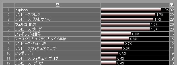 これは検索で当ブログにアクセスした方を抽出し、その検索ワードをランキングした9月1日の結果です。「ワンピース ブログ」や「シャボンディ諸島」などのワードが並んでいます。大体いつもこんな感じです。対して翌日は・・・