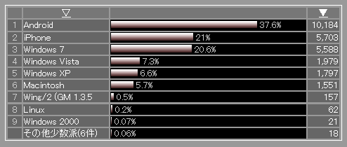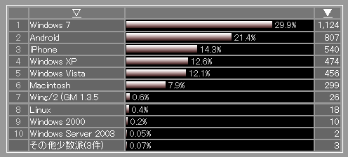 こちらは、アクセス者の使用OSの解析結果です。通常はWindows7>Android>iPhoneの順になっていますが、今回、「ホーディ 正体」で検索をかけた人たちの多くはスマートフォンユーザー(※タブレット型端末ユーザーもいるが、解像度解析により主にスマホユーザーと分かる)であることが分かります。TVを見て気になったことがあれば、