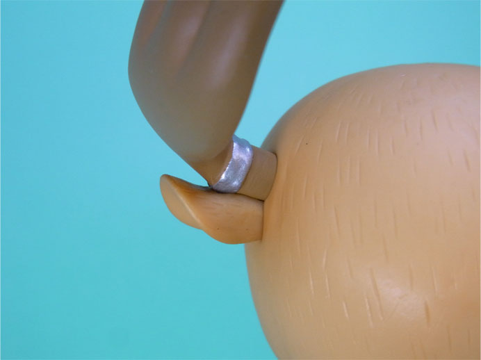 3.9ミリと、0.2ミリの差が!この差がクリティカルに効いているのか、それとも内部の径の大きさに差があるのか分かりませんが、おそらくリュックなしの方の穴が小さいために、下半身にしっかり装着できない模様です。おい、メガハウス。