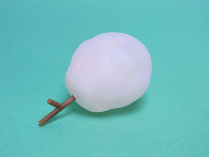 付属のわたあめは、差し替え腕パーツの蹄の間にある穴に柄の一部を差し込んで手に持たせます。わたあめの内部は空洞になっていて見た目の割りに軽いので、わたあめを持たせていても腕の角度によらず安定しています。写真では分かりづらいですが、わたあめはクリアパーツに、白をベースにして薄っすらピンクの塗装がされています。