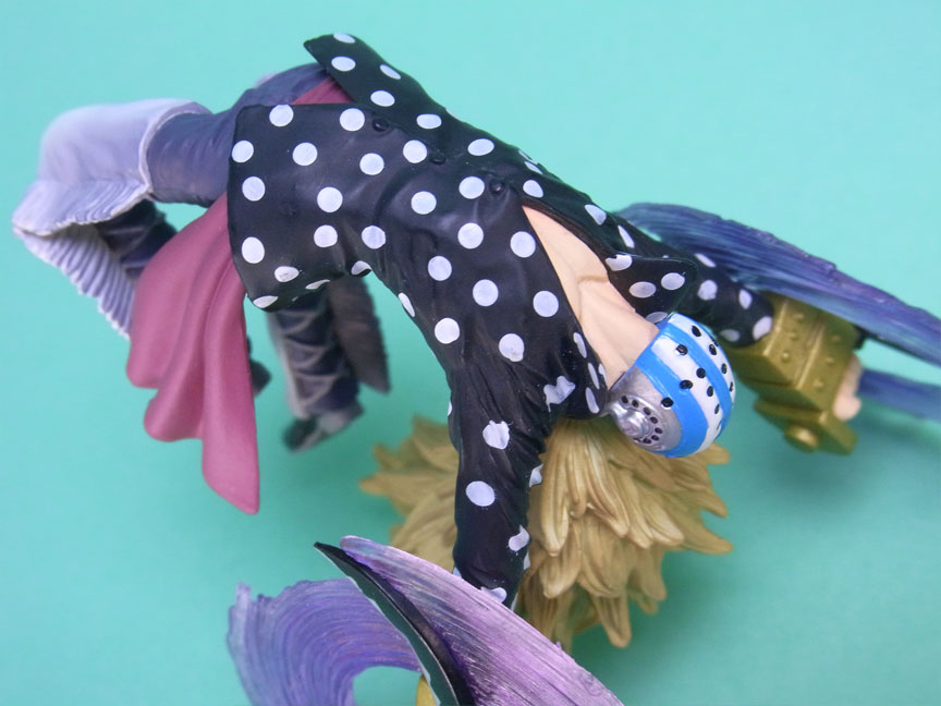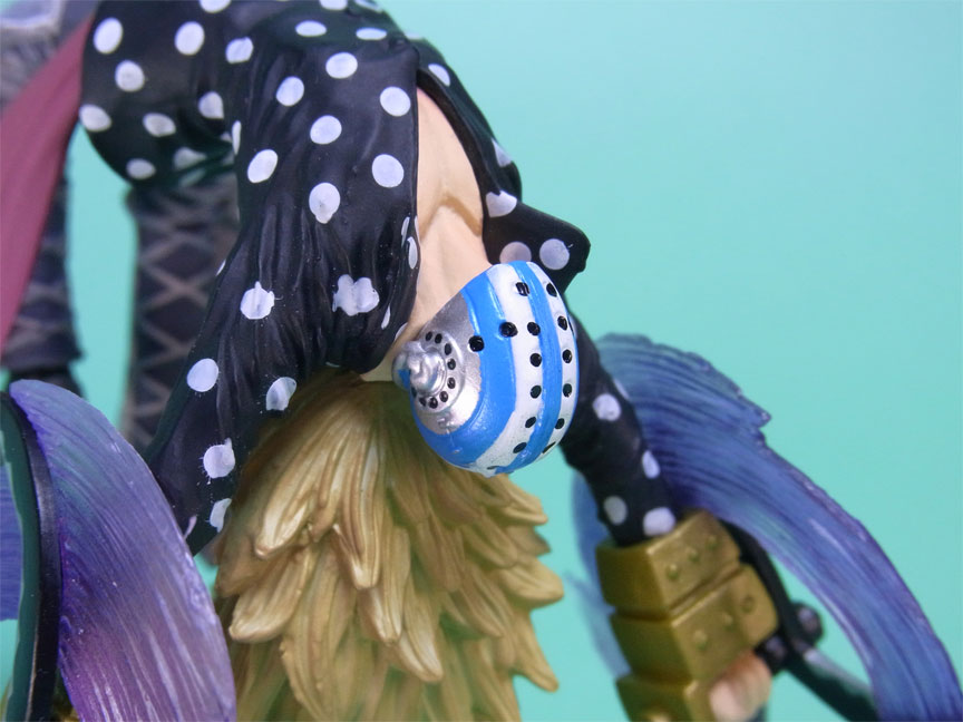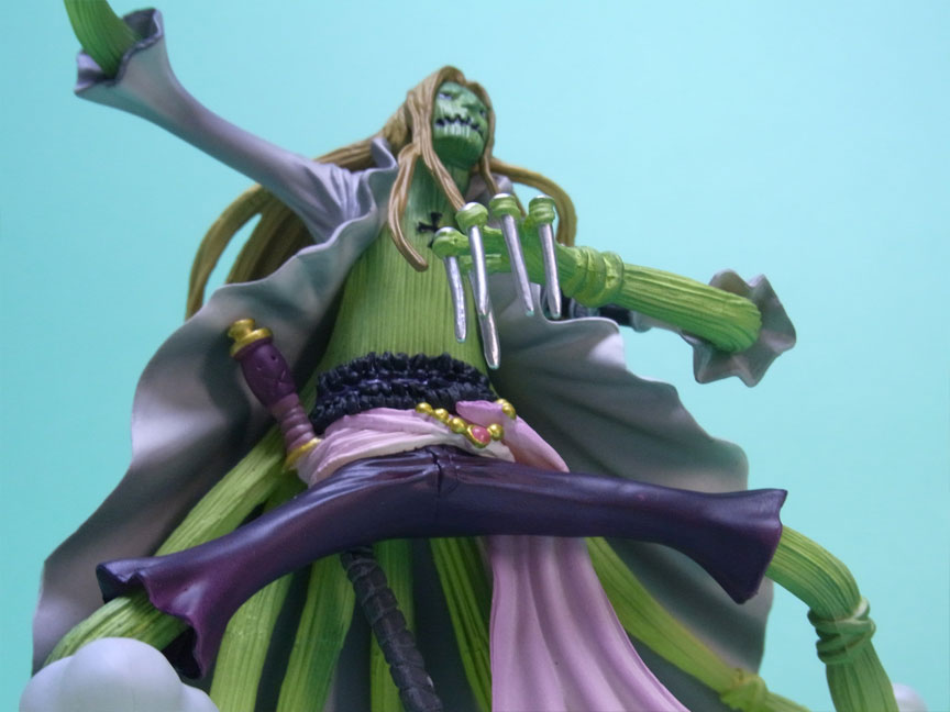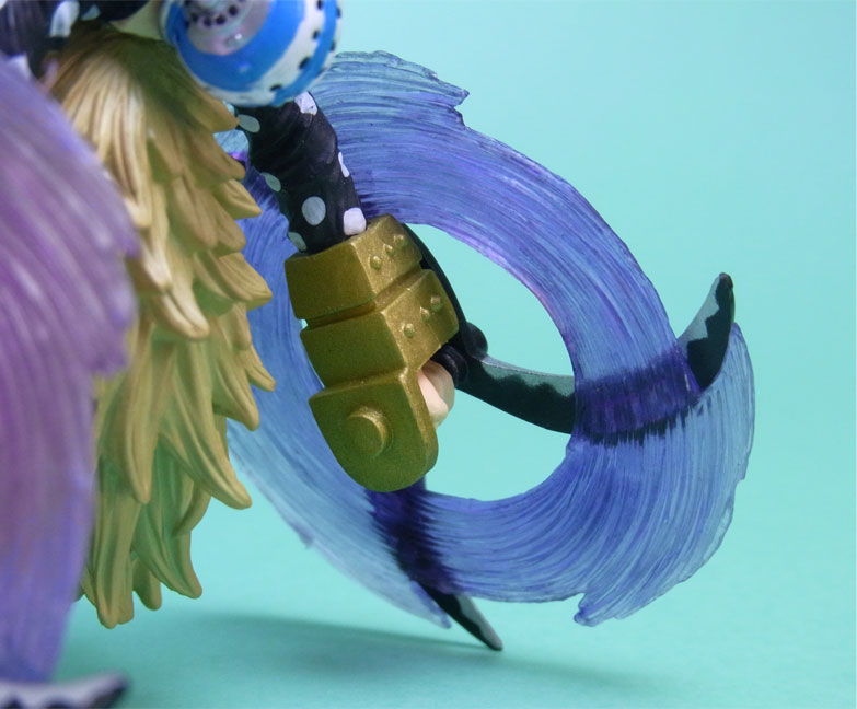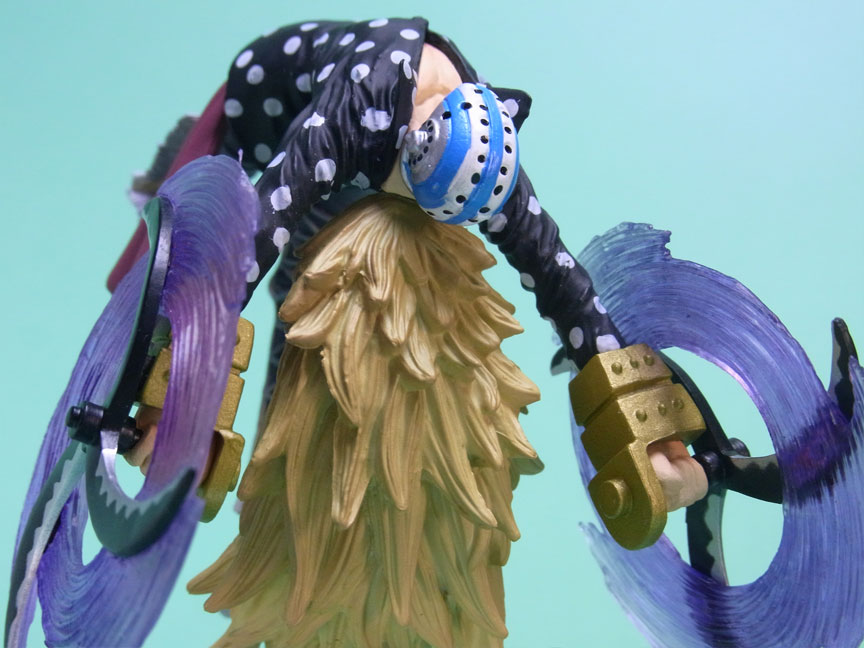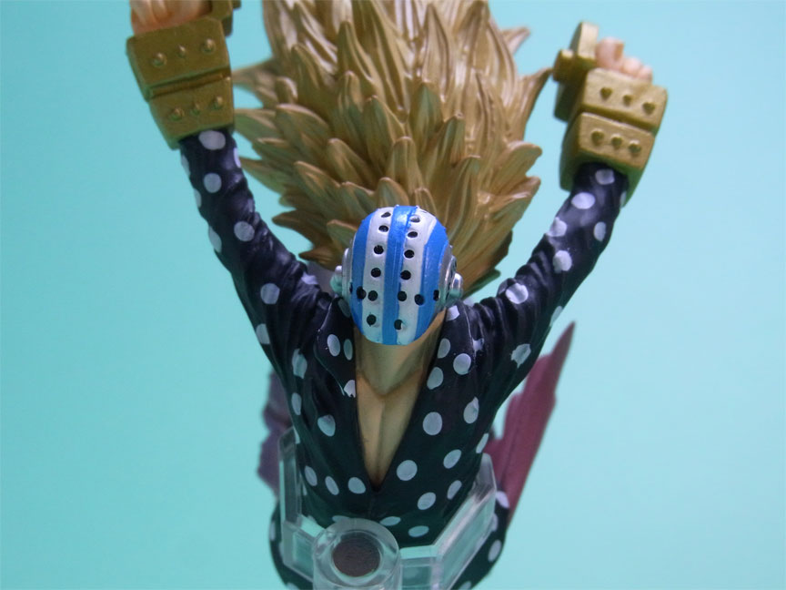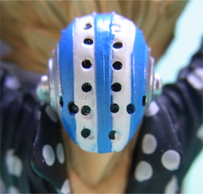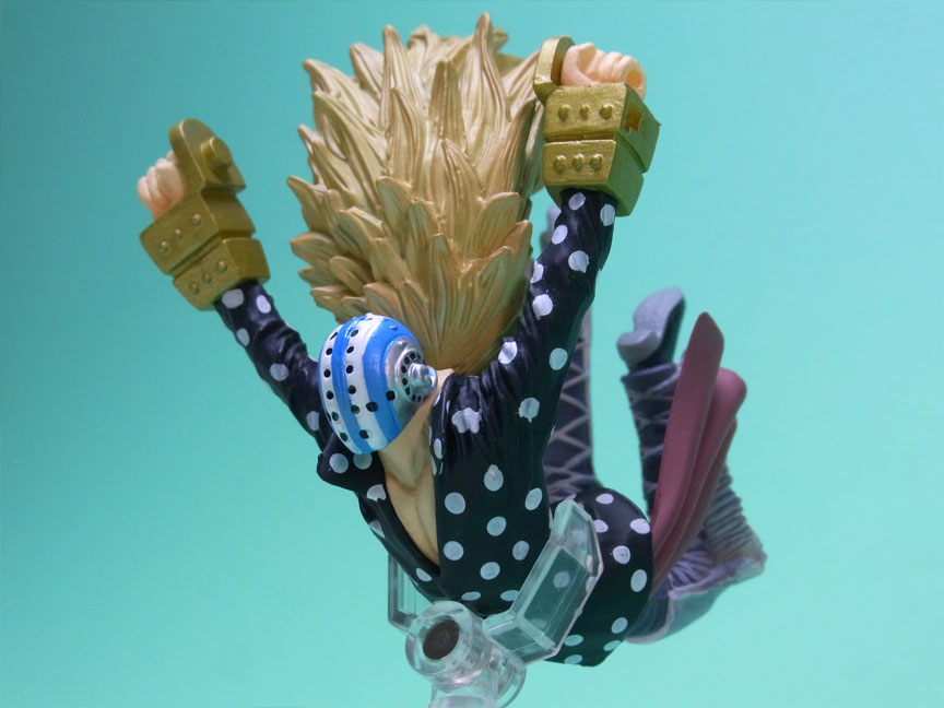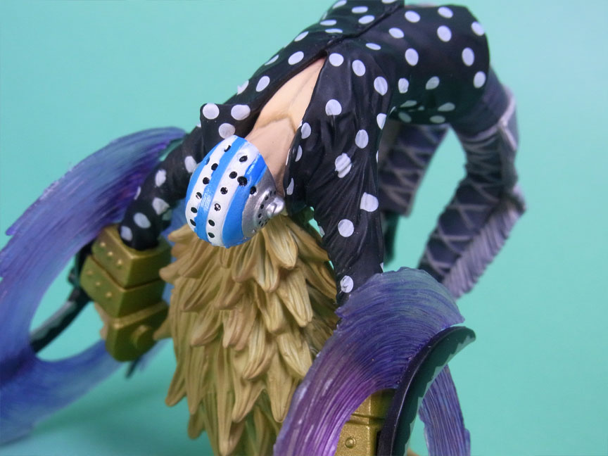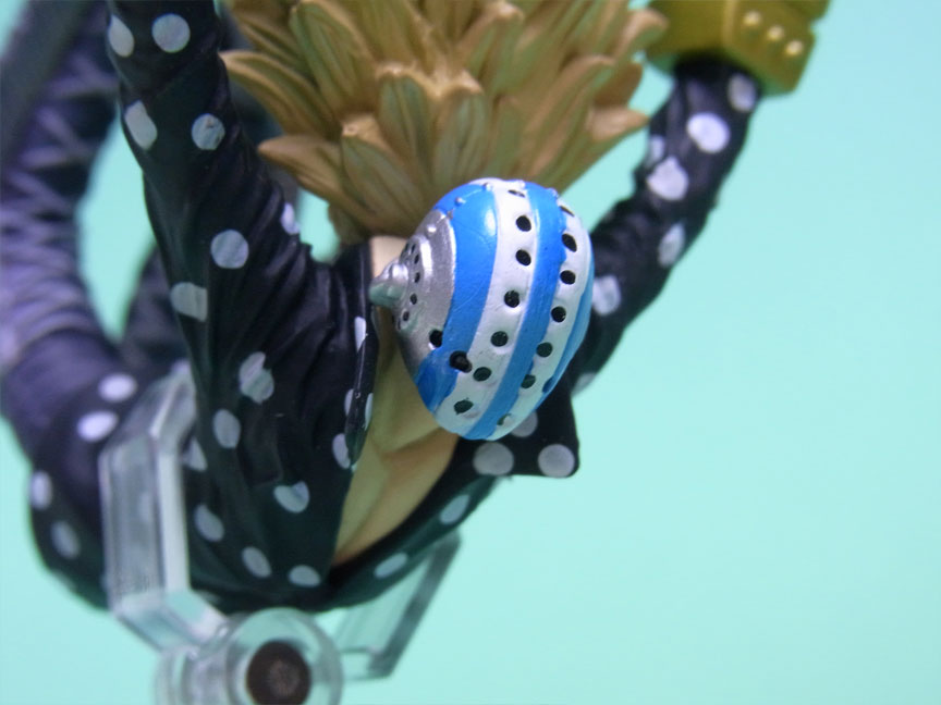 藁」に関連していることは間違いなく(→”ワラワラの実”?)、この能力は体が藁で覆われた状態になっていると考えられます。したがって、色はちょうどこの前髪と同じようなベージュ色が相応しく、一方、前髪はホーキンス本来のもっと明るい金髪というのがオリジナルのカラーリングのはずで、TVアニメではそのようなカラーリングが採用されています。しかし、このフィギュアはどういうわけか緑色ですw