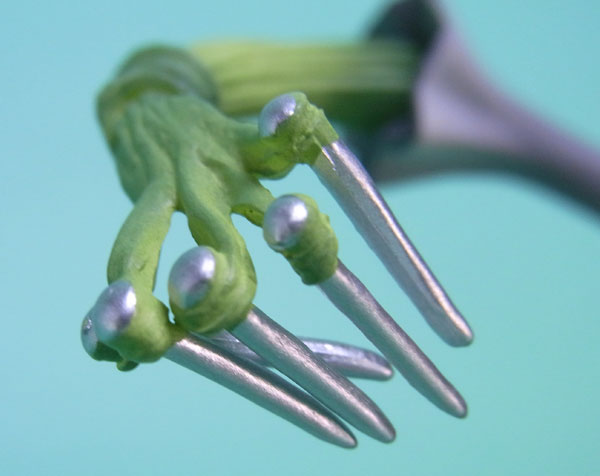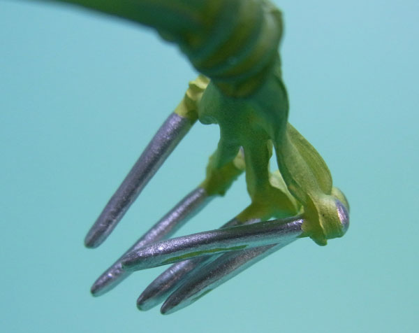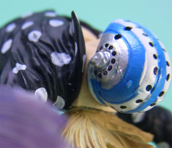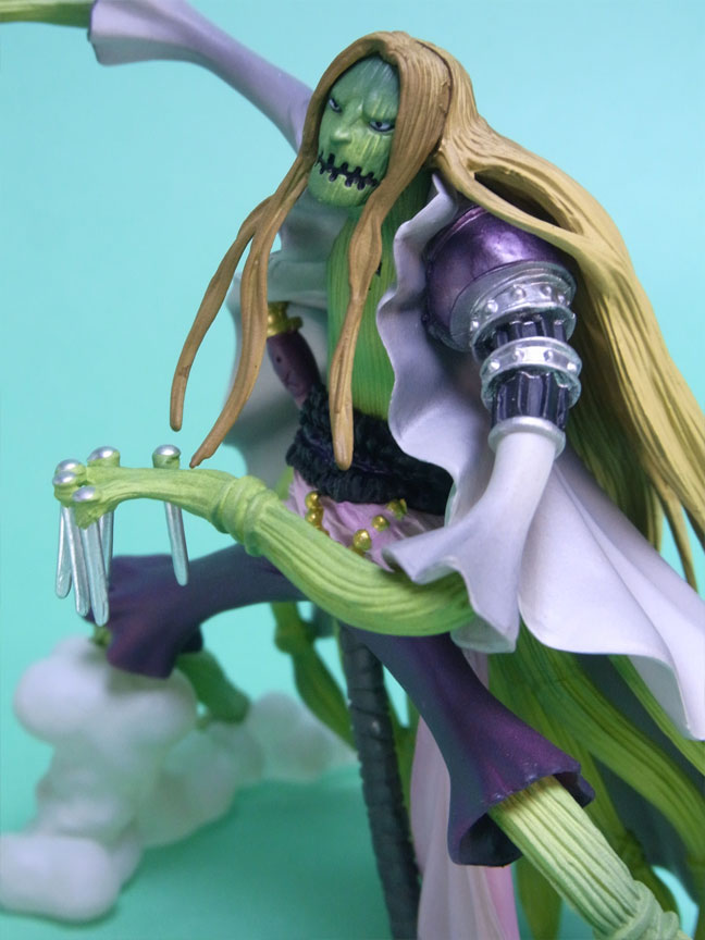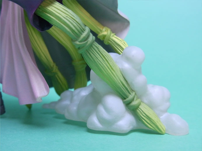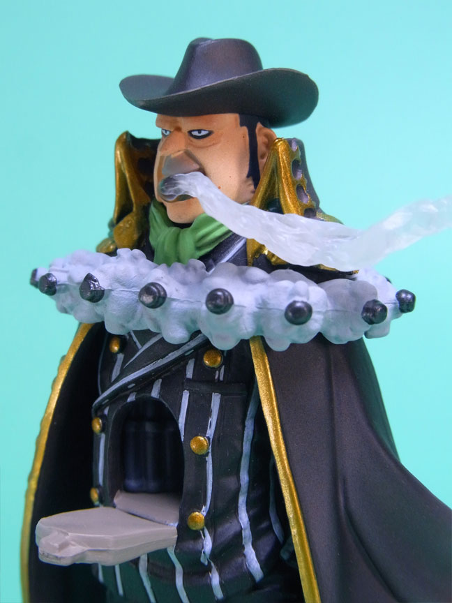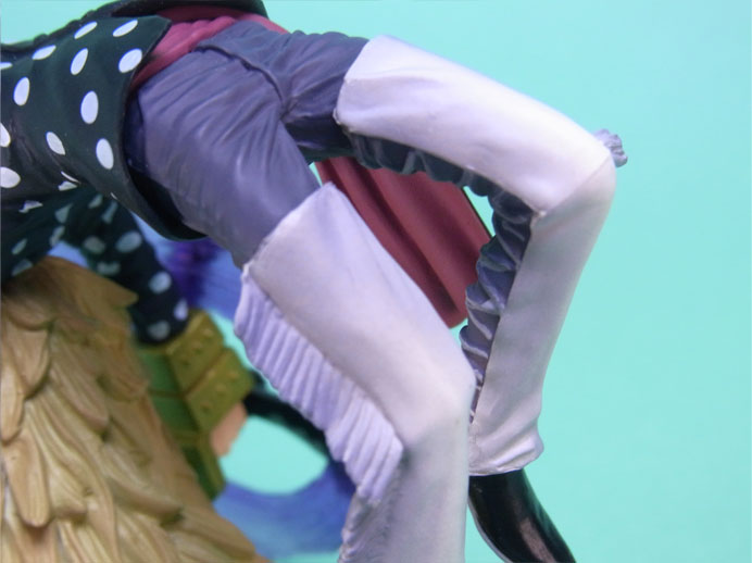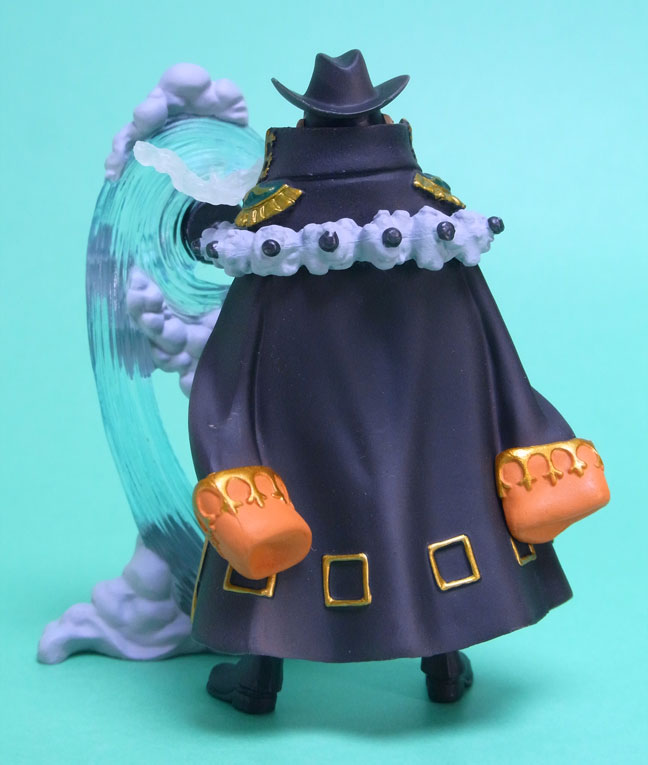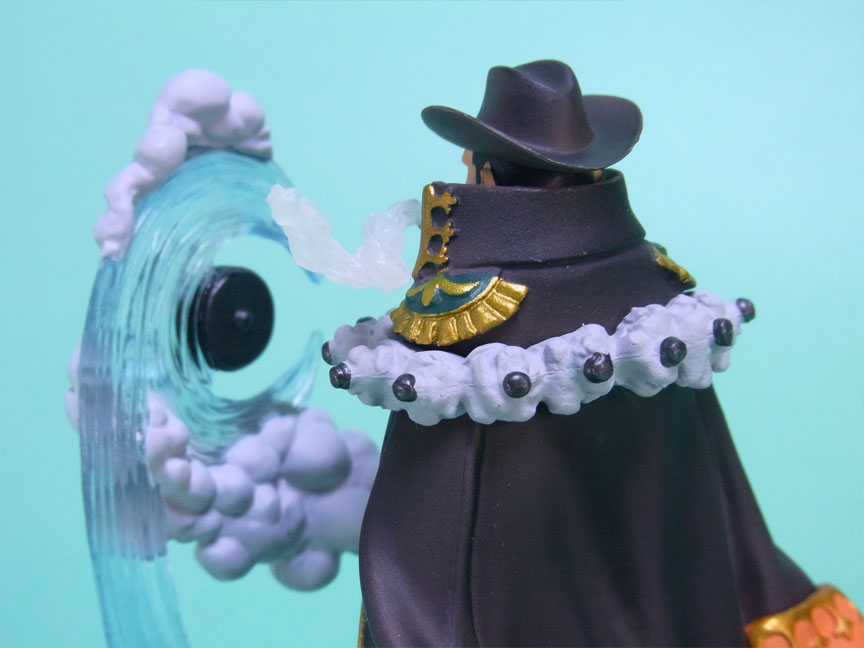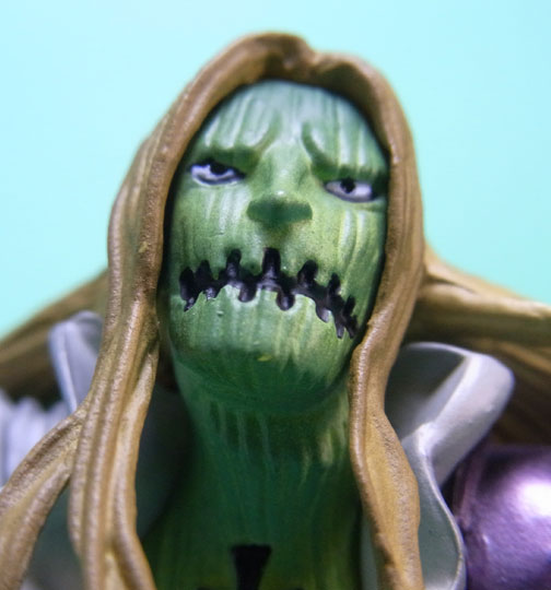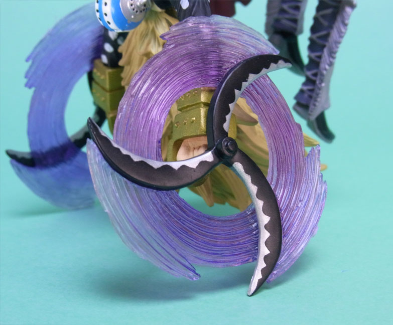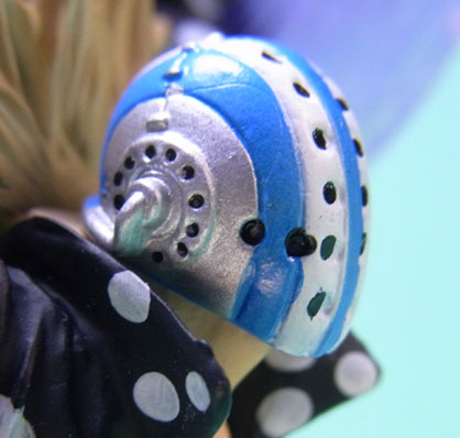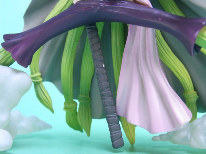 藁」に関連していることは間違いなく(→”ワラワラの実”?)、この能力は体が藁で覆われた状態になっていると考えられます。したがって、色はちょうどこの前髪と同じようなベージュ色が相応しく、一方、前髪はホーキンス本来のもっと明るい金髪というのがオリジナルのカラーリングのはずで、TVアニメではそのようなカラーリングが採用されています。しかし、このフィギュアはどういうわけか緑色ですw