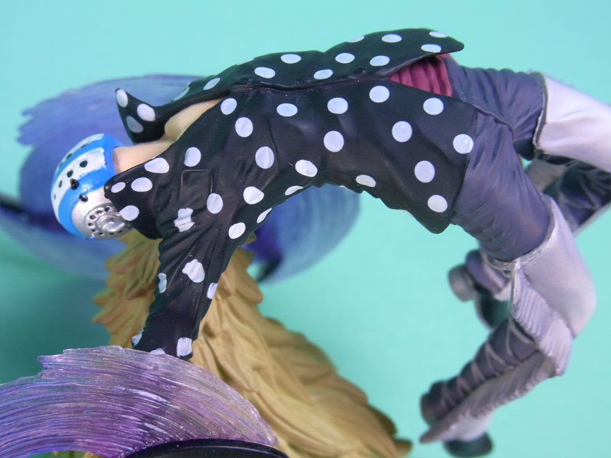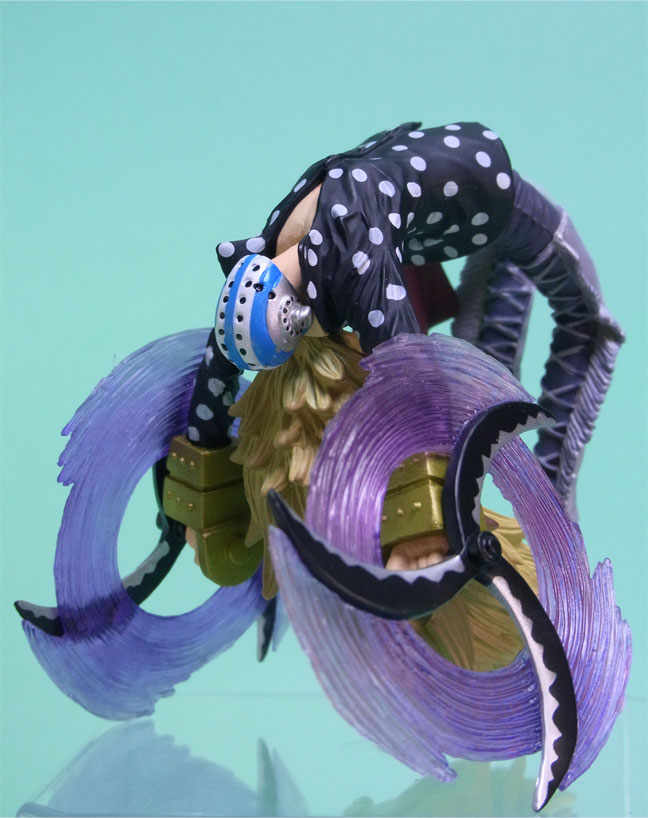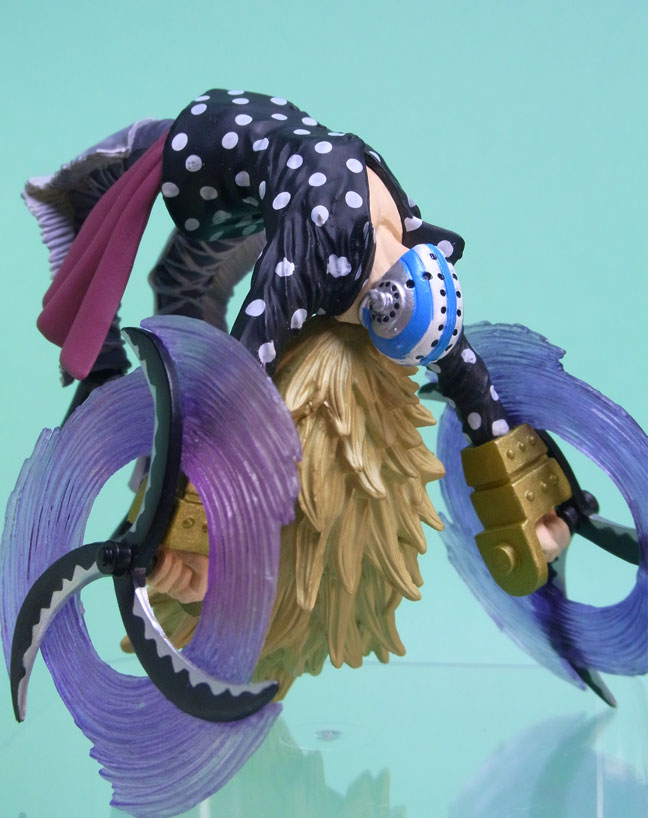 こんな技あったっけ?と思ったのですが、ポージングは505話の戦闘シーンの再現のようです。バク宙しながら腕の武器を回転させて海兵を斬っているところです。