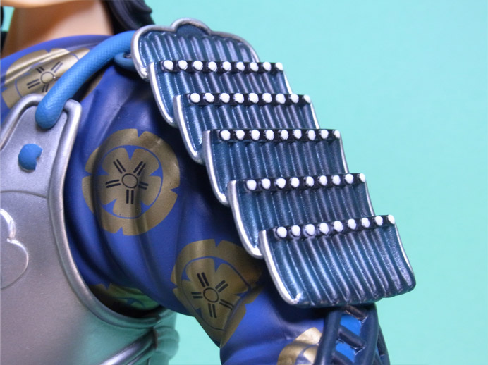 甲冑は細部まで忠実に再現。絵では見えないところまで、リアルに造り込まれています(→この甲冑は右側で開くタイプらしい)。腰に巻いてある縄も模様や結び目、たわみ具合などリアルです。