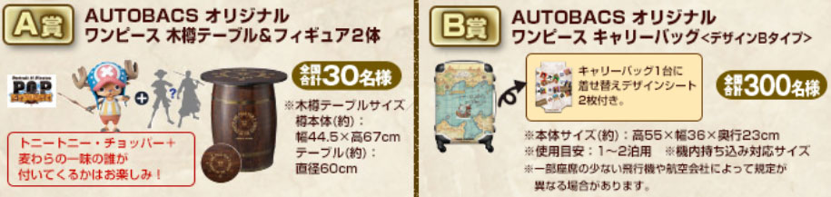 キャンペーン期間中、全国のオートバックスグループ店舗で3,000円(税込)以上購入してWEB応募すると、抽選でオリジナルワンピースグッズが当たる。応募はオートバックスポイントアップカード会員(無料)限定。