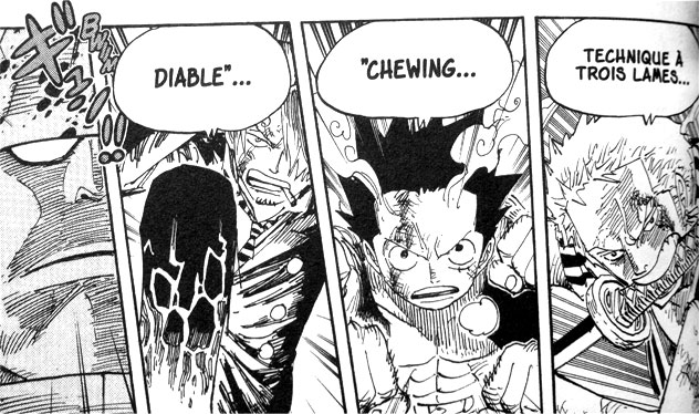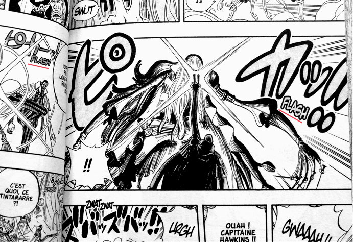Le regretté Portgas D. Ace (snif !) avait l’admirable capacité de tout enflammer sur son passage. めらめら signifie en effet « s’enflammer, s’embraser » (avec l’idée que le feu s’étend très vite) et est souvent associé au verbe 燃える (もえる brûler, qu’on retrouve dans 燃えてきたぞ, « je suis chaud comme la braise », qu’emploient Sanji, ou le Natsu de Fairy tail). On peut aussi l’employer dans un sens métaphorique, pour parler de sentiments.