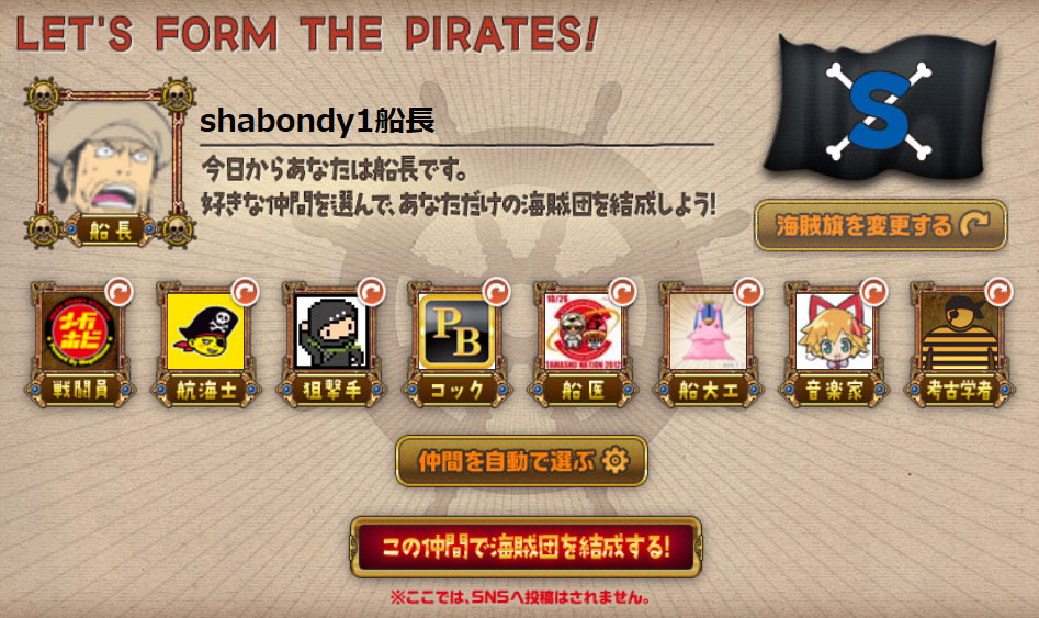 ※アカウント画像が使用されるだけ)、海賊旗を選択して海賊団を結成します。