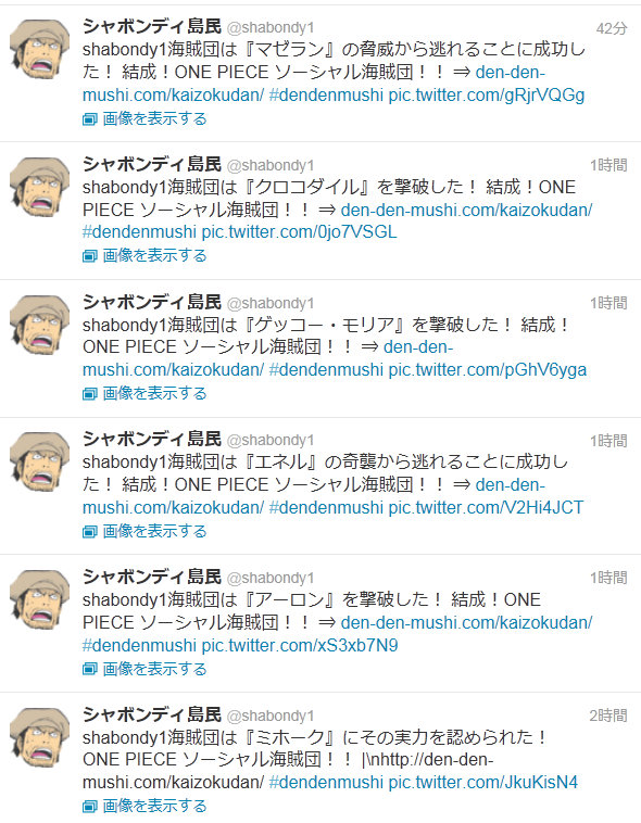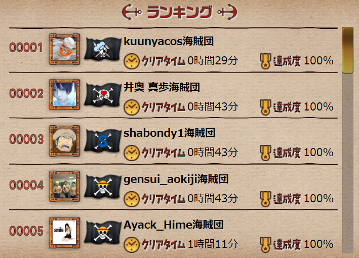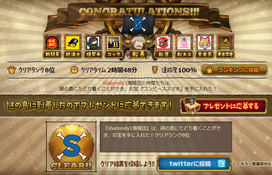 TwitterのフォロワーまたはFacebookの友達から仲間を選んで海賊団を結成し、麦わらの一味より先に「未来の通信機(ワンピーススマホ)」が漂着した島を目指すというもの。船員やアイテムをうまく選択し、立ちはだかる敵を倒して航路を進みます。ゲームクリアすると、ワンピーススマホが当たる懸賞に応募することができます。