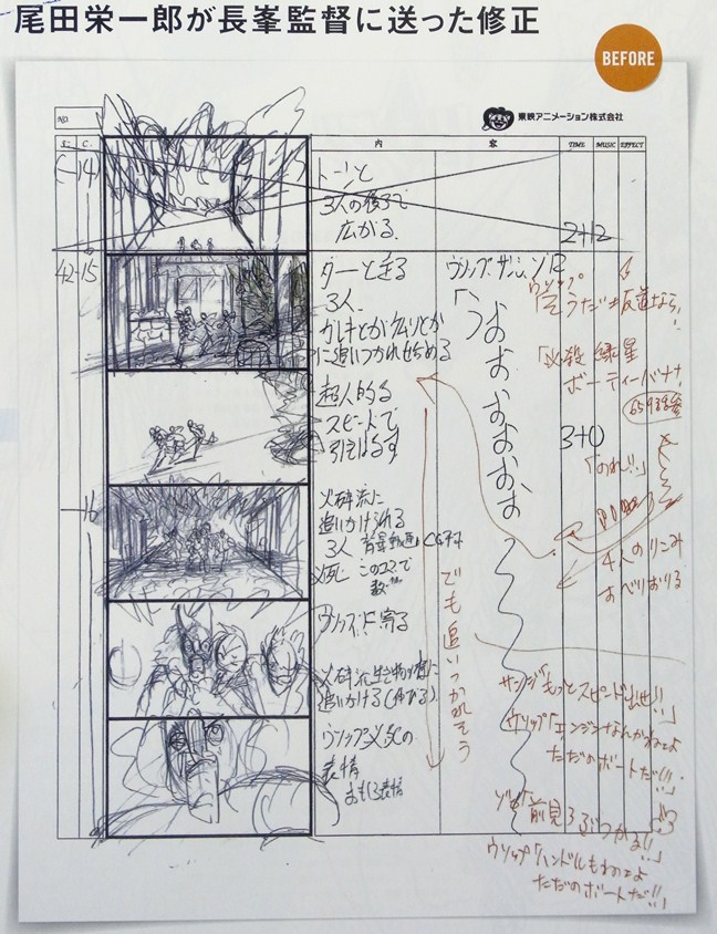 ※本誌掲載の絵コンテの実際の直し一例(赤字が栄ちゃんの修正)。ウソップらがルフィを背負って火砕流から逃げるシーンは原案ではただ坂道を走って下るものでしたが、修正により緑星ボーティーバナナを使って滑走するシーンに変更されています。シーン変更に伴う台詞のアイディアやボーティーバナナが登場する「659話参照」とまで丁寧に書かれています。