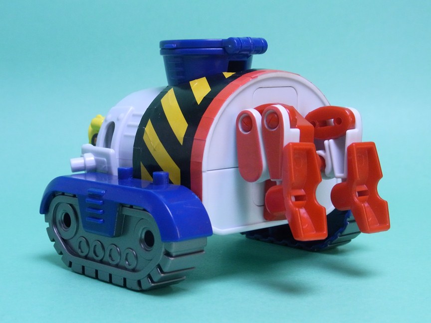 タンクの変態(変形)は恐竜の頭部がひっくり返って将軍の頭部に変わります。クルッとひっくり返って変形する原作と違い実際は分解する必要があるのですが、ただの付け替えではなく、ちゃんと頭部を収納しているところがいい感じです。他はキャタピラの取り付け位置を移し、コックピットの入り口部分(ドクロのマーク)をへっこませ、背部の将軍の脚パーツを伸ばしています。