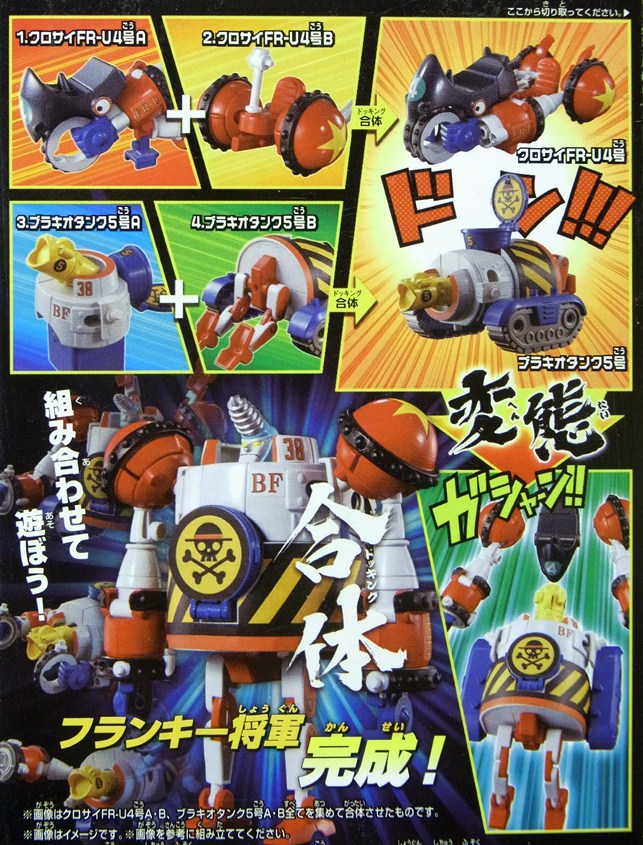 こちらはラムネ菓子の食玩で、全4種中各2種ずつ揃えるとブラキオタンク5号とクロサイFR-U4号が完成し、その2つを合体するとフランキー将軍が完成します。パーツは一部組み立て済で、一部はプラモデルのようにランナーについたままになっており自分で組み立てます。