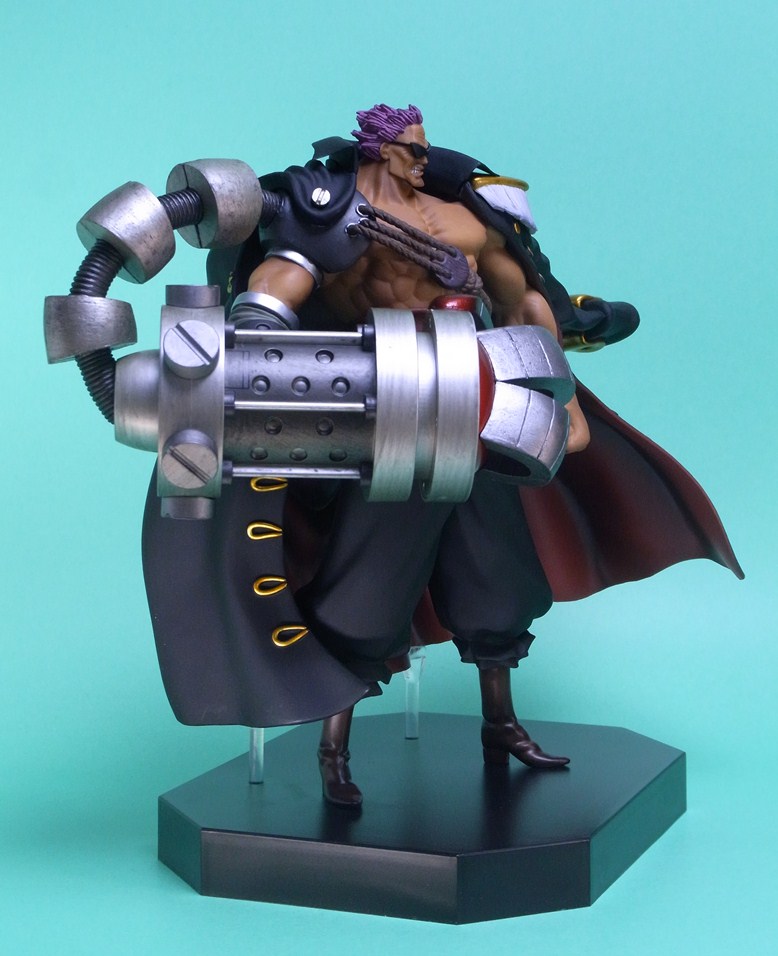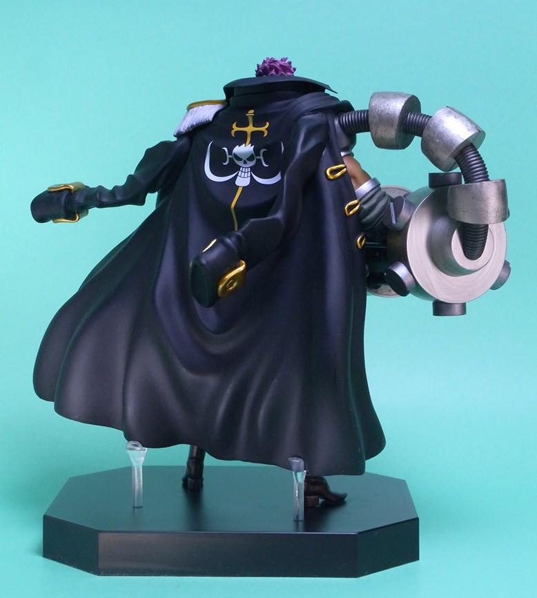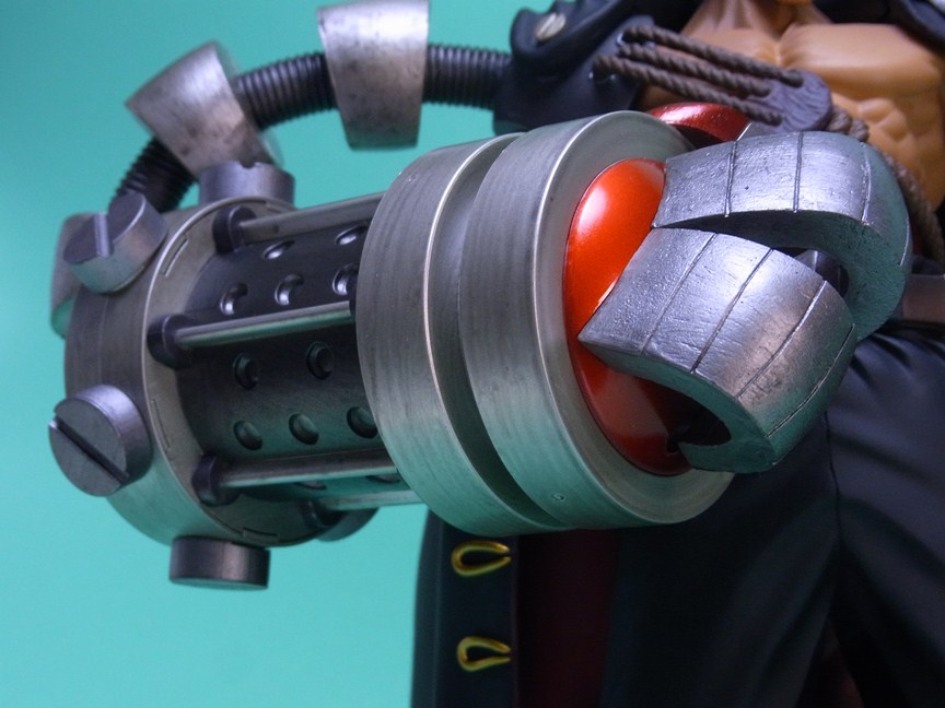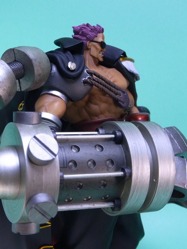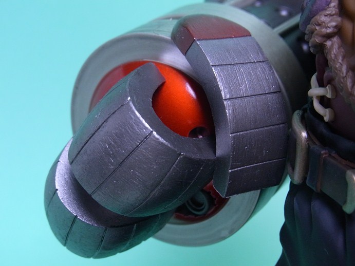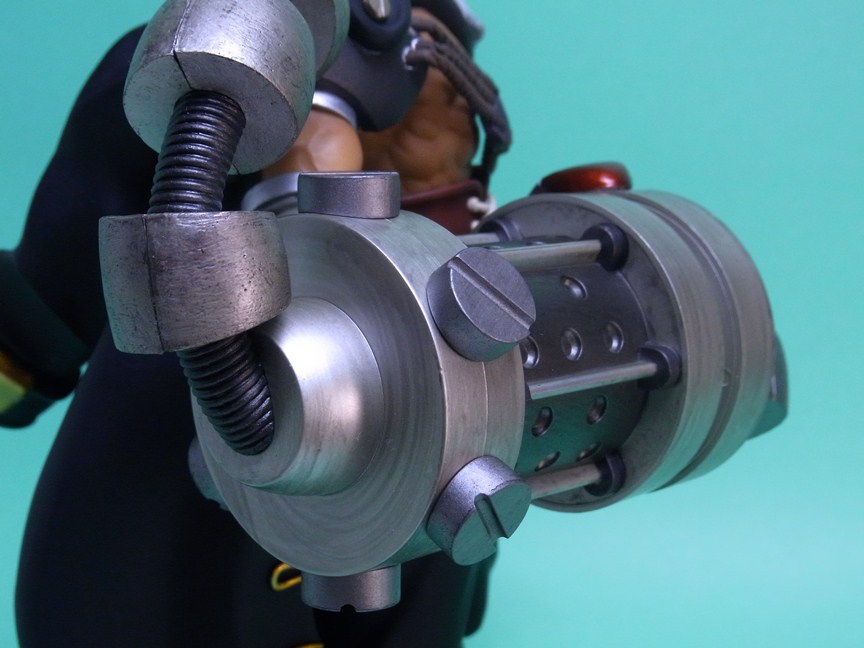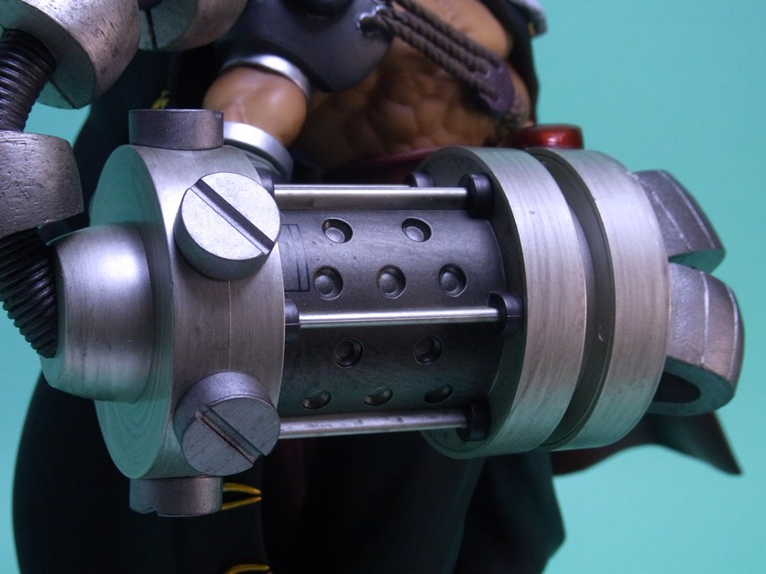 ごつくて重厚な右腕のスマッシャーとコートの金色の装飾が映えて、全体としての仕上がりは良好です。スマッシャーは設計上の理由かもしれませんが、素材にABSを採用していることはメカらしさが出て功を奏した形です。顔もオリジナルに忠実でキャラクターらしい表情をしており、全体のシルエットもよく似ています。サイズは大きく横幅もかなりあるため、フィギュアの存在感は結構なものです。