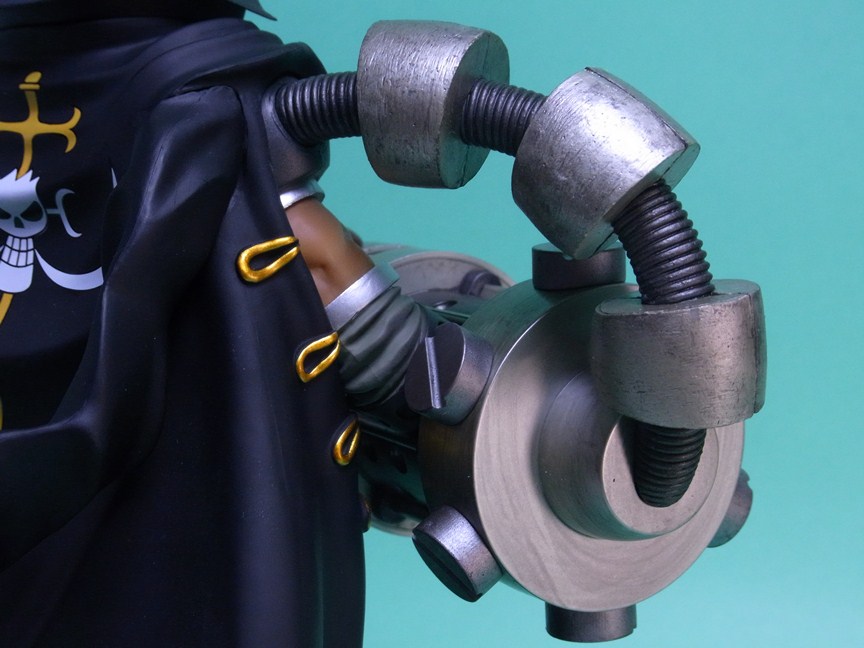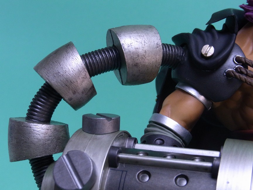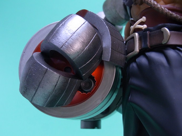 設定画より、胸の前を走るロープは右腕のスマッシャーの重みを支えるためとのこと。ロープの結び目を見る限り、デッドアイ(帆船のロープを張る木製の滑車)に負荷がかかっているように全然見えないのですがw