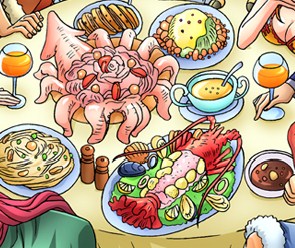 イーストブルーでの心に残る数々の名シーンや登場するキャラクターをイメージした、 目にも楽しくお腹も満たされる料理をお楽しみいただけます。昼はアラカルトと豪快なワンプレート 料理を用意しており、夜はアラカルトの他、「エピソードイーストブルー」と題したコースメニューや オリジナルのカクテルやソフトドリンクなども提供いたします。