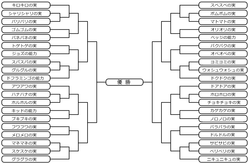 本当は”キロキロの実”に優勝させて出来レース乙!としたかったのですが、シミュレーションを進めていくと、あらゆる物を弾くことができる”ニキュニキュの実”は全ての実に勝つ手段があるということが分かり、まさしく最強だという結論に至りました。ニキュニキュもまた