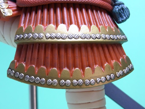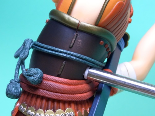 鎧は造形・塗装ともにクオリティが高く、紐の縫い模様や留め、金具の質感まで細部にこだわりが見られます。鎧のパーティションはちょうど蝶番のところにあり、さらにわざと隙間を作っているのかリアルです(実際の鎧はどうなってるか知りませんけど)。侍というか足軽風の鎧ですね。ちなみに、刀は抜刀できます。